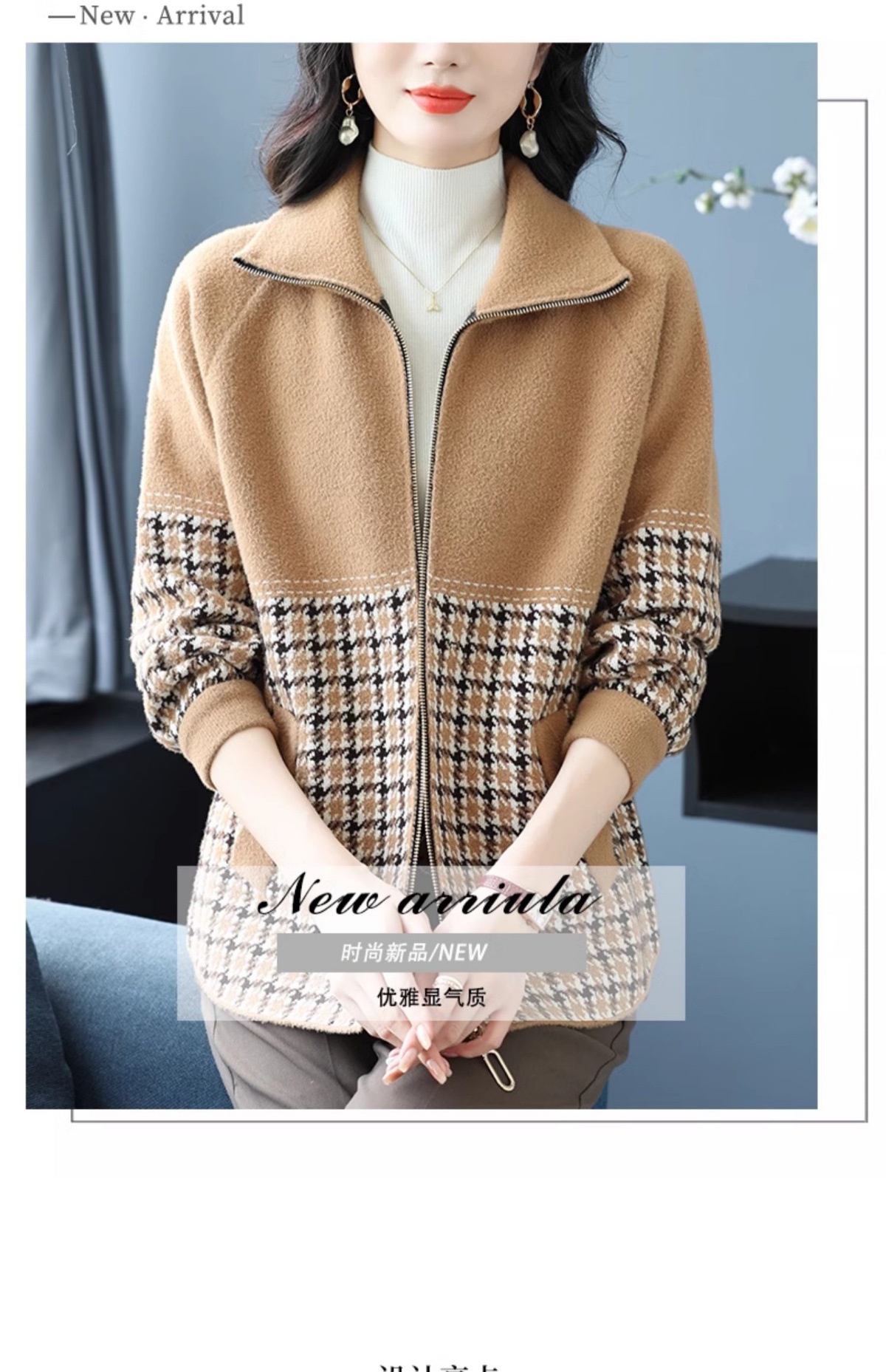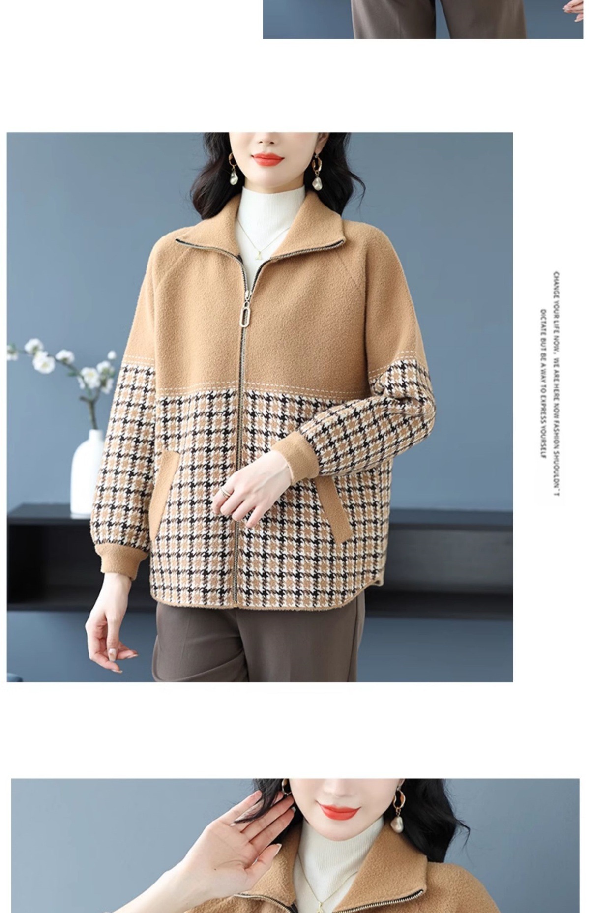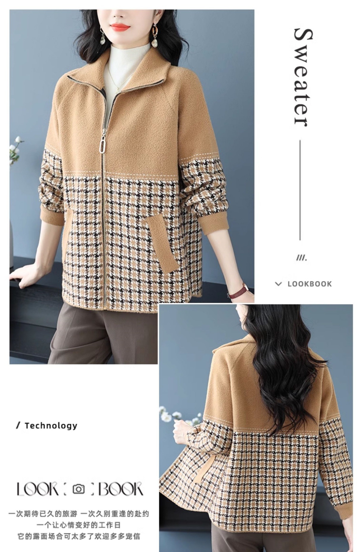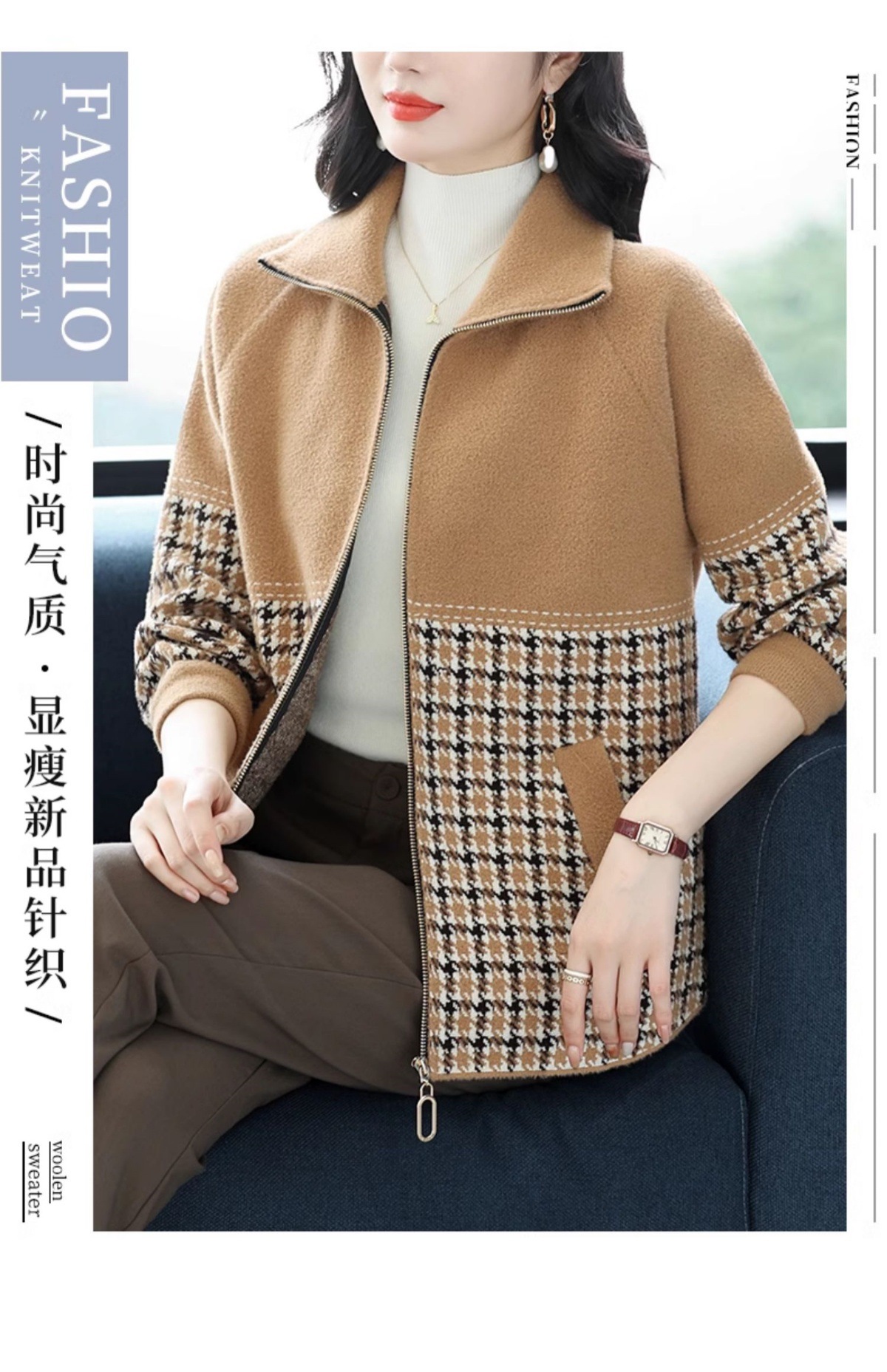 CC-10-5569大码翻领针织开衫短外套女春秋宽松显瘦毛衣拉链洋气小个子上衣女