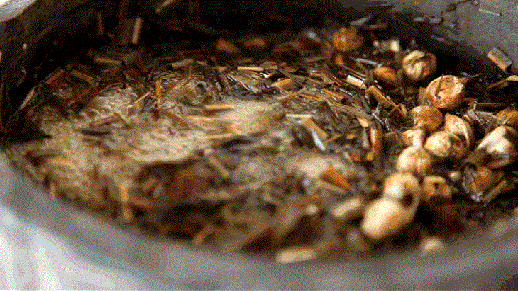 檀香以酒浸之,在土灶台用柴火微炒。