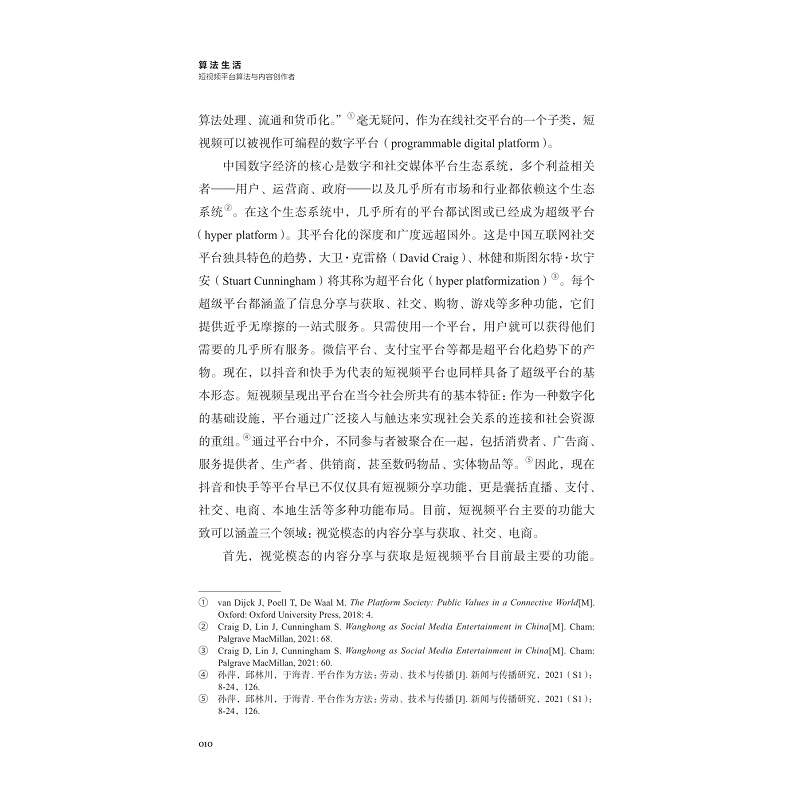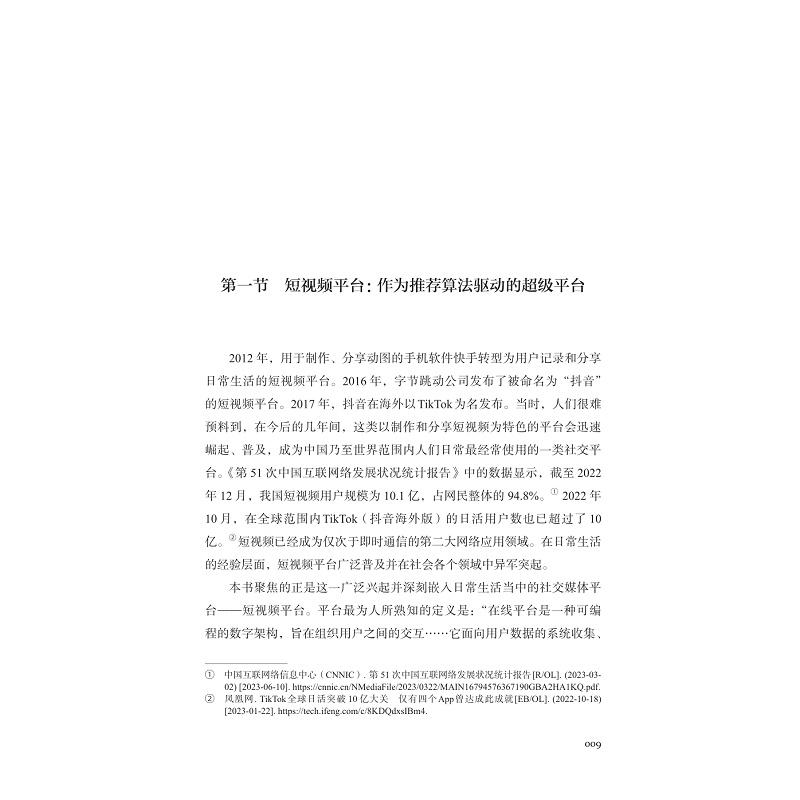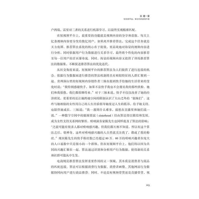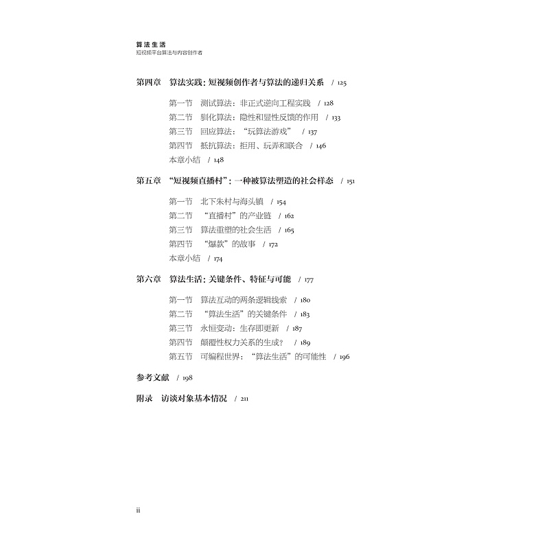 本书以短视频平台算法和内容创作者为考察对象,通过探讨短视频平台内容创作者与算法进行互动的全过程,揭示人们如何理解和应对深刻嵌入乃至构成他们日常生活的算法以及从中浮现的新社会样态的可能。算法与人的复杂互动代表了现阶段的互联网信息技术与日常生活相互交织的一种形式,算法不仅是“中介”人们的生活,更是“构成”人们的生活。算法生活关涉主体的想象,又关涉主体的实践,更是整个社会机制的改变,它提示了一系列颠覆性关系生成的可能并最终指向一种可编程世界的可能性。
