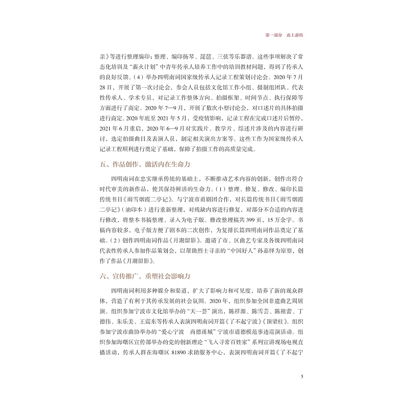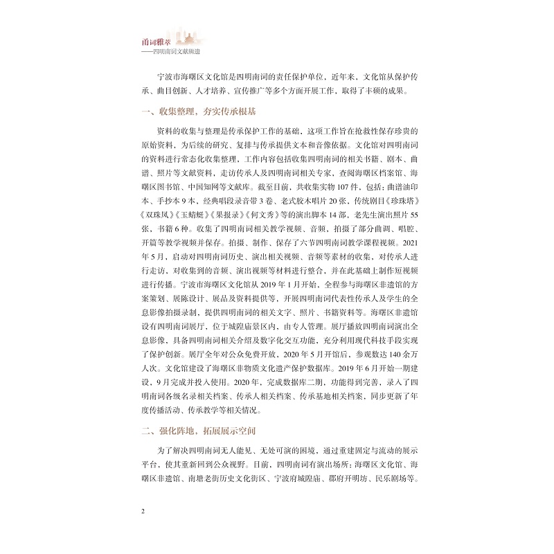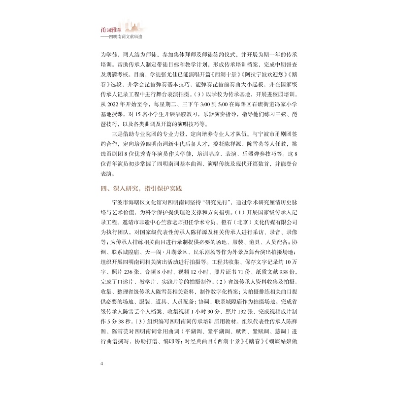 四明南词俗称“四明文书” “宁波文书”,是浙江省地方传统曲艺之一,是用宁波方言说唱的弹词,早期为按生、旦、净、末等分角色演唱,后发展为一人自弹三弦演唱,一人打扬琴伴奏,也有二三人加用琵琶、二胡等伴奏的。“四明南词”经国务院批准列入第二批国家级非物质文化遗产名录。本书以四明南词国家级代表性传承人、传承人弟子及相关人员的访谈口述,项目保护、项目基本信息,项目概述、相关文献、报道等为辅,图文结合,约 5万文字, 100张左右图片形成《四明南词国家级非遗保护调研丛书》。