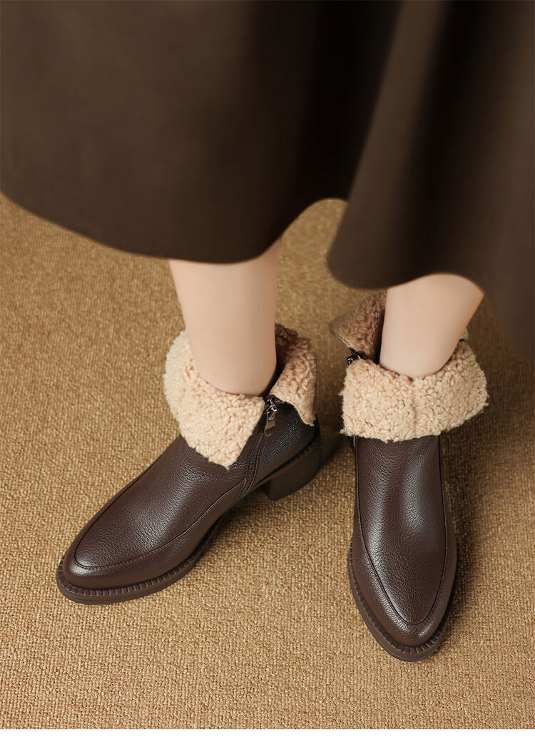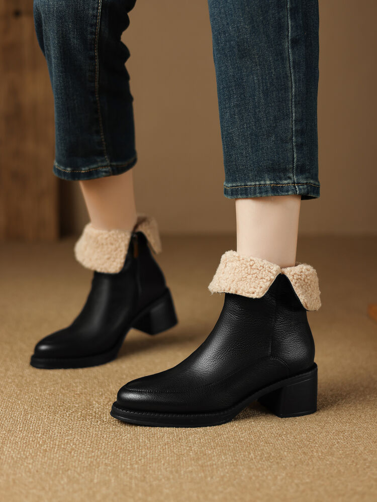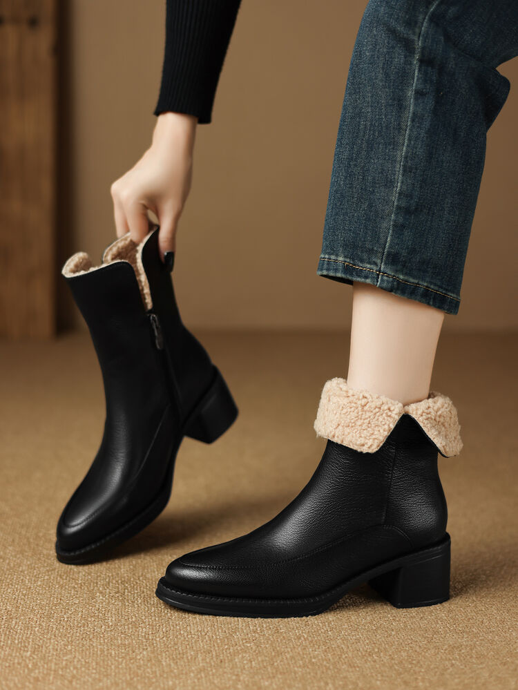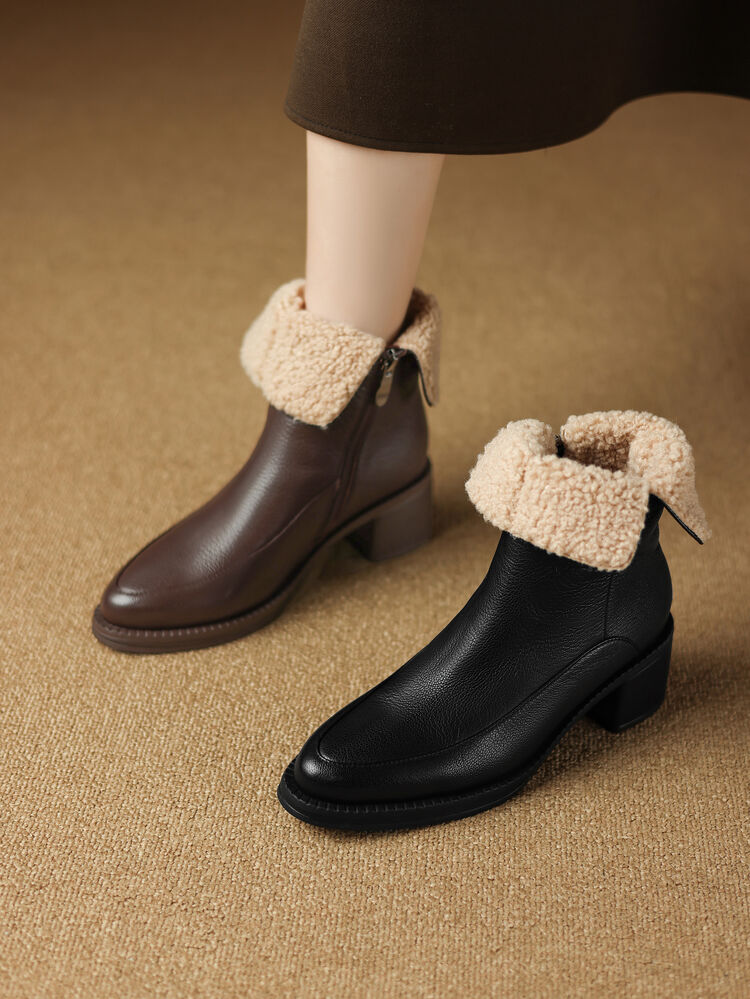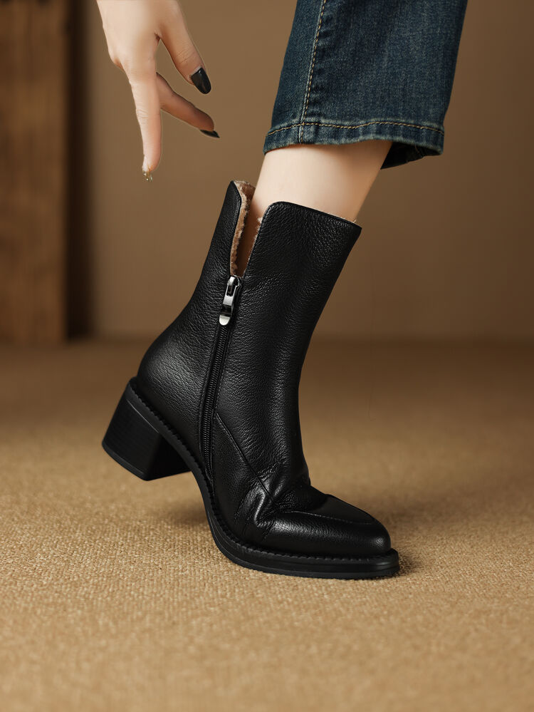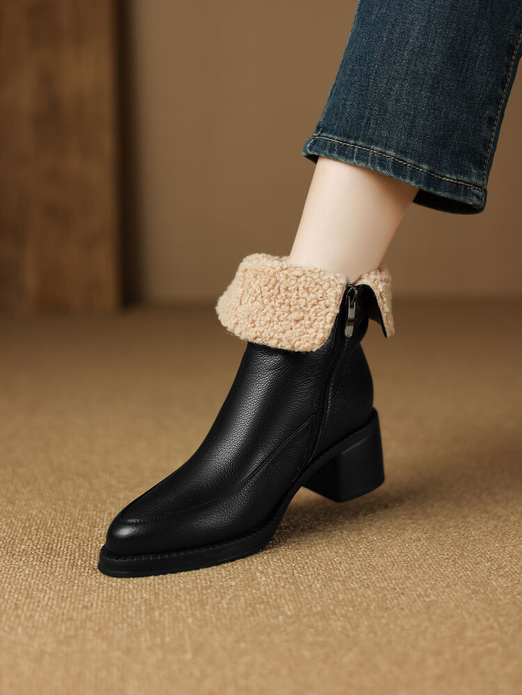 【预售5天】巨保暖~真皮尖头粗跟侧拉链短靴女加厚绒毛毛鞋冬季新款高跟棉靴DTN&259-2