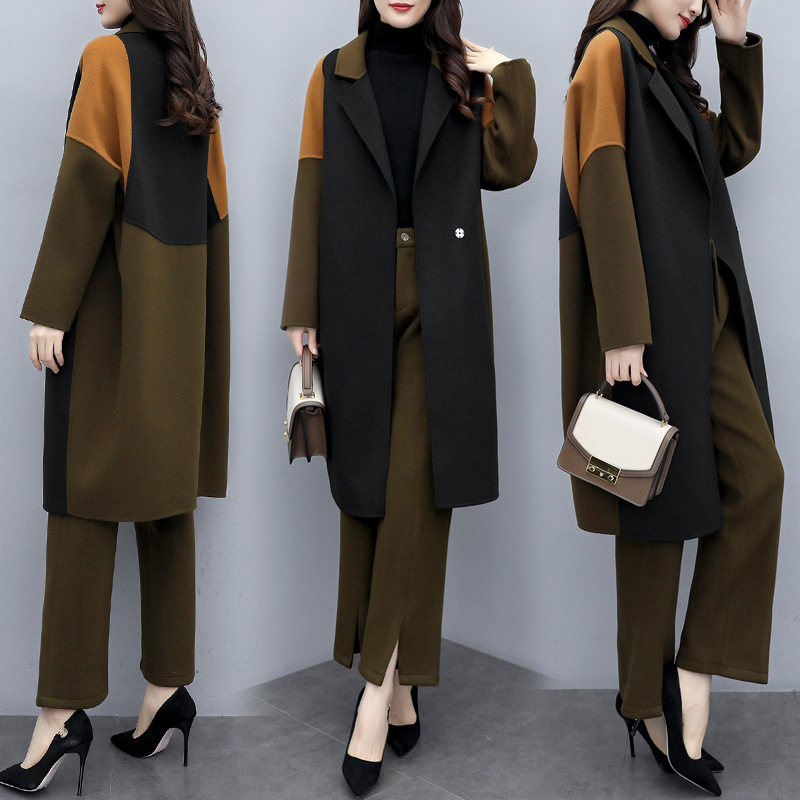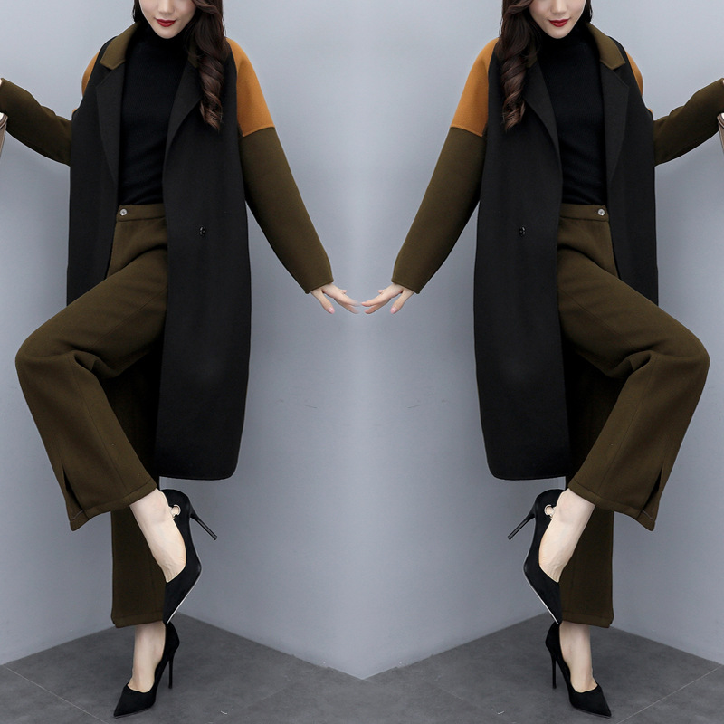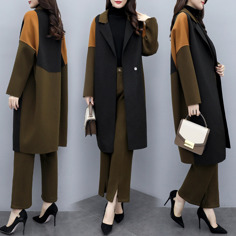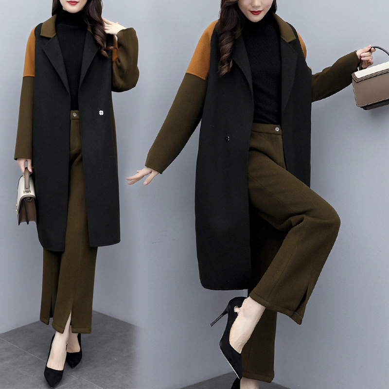 KLJ-秋冬新款宽松大码拼色毛呢外套阔腿裤两件套