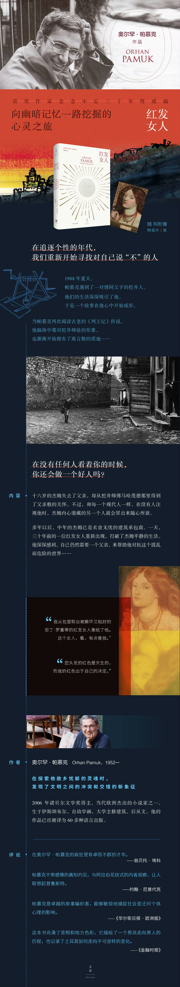☆ 诺贝尔文学奖得主举重若轻之作,帕慕克首次尝试“写一部更短的小说”,尽管这个故事已经酝酿了三十年——它始于1988年夏天,帕慕克在住处附近遇到的一对情同父子的挖井人。
