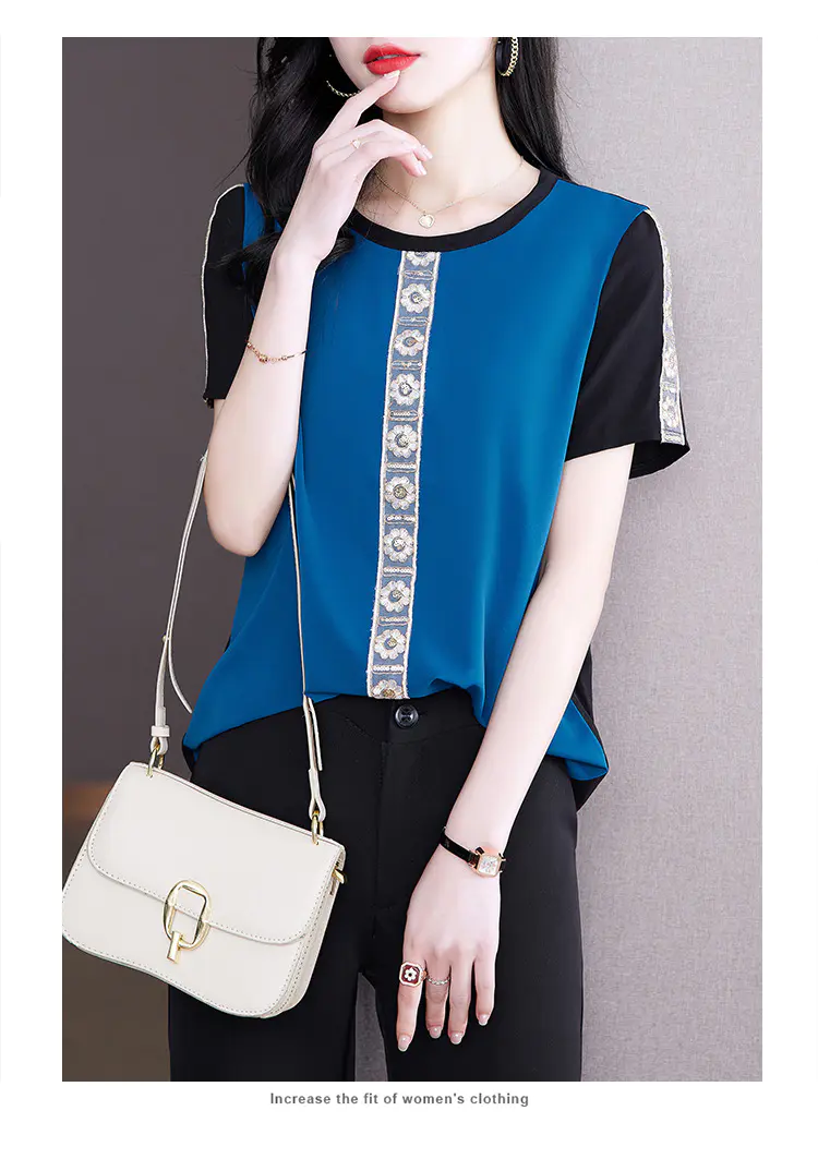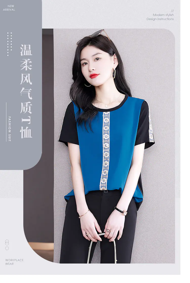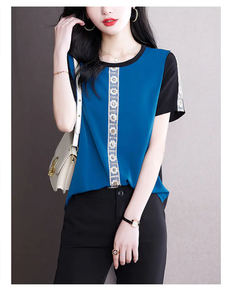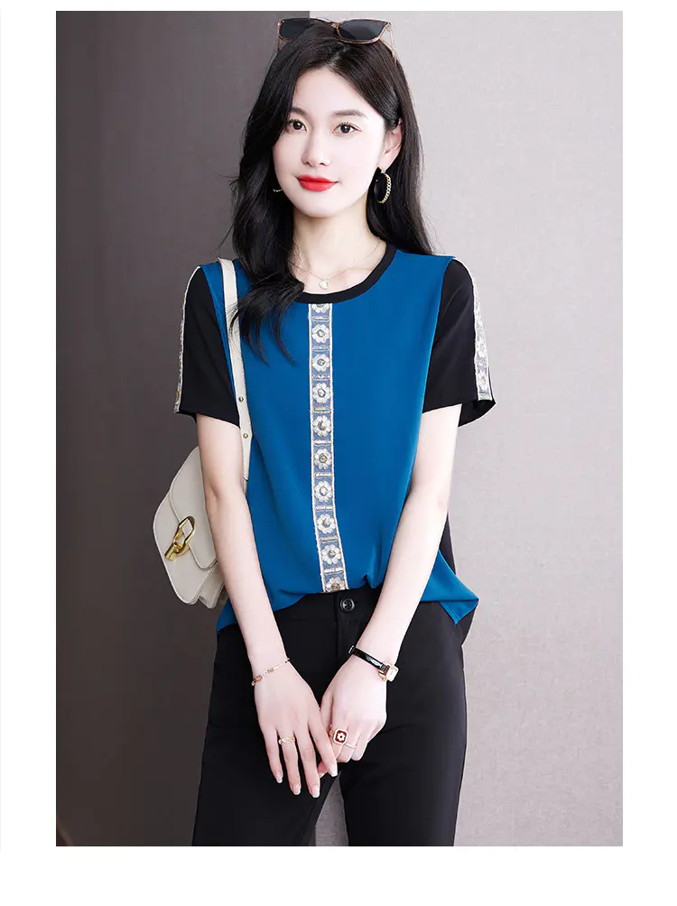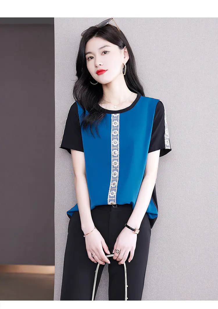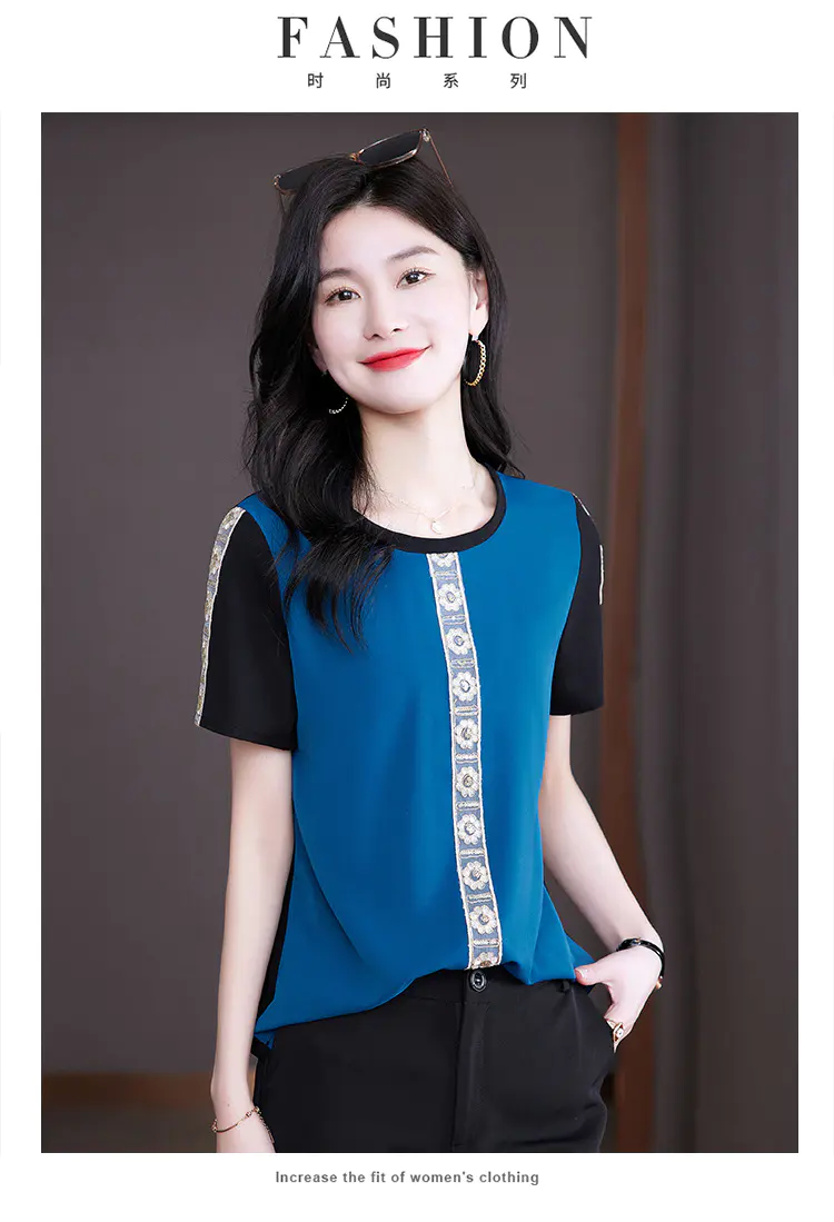 AHM-19573夏季新款时尚气质圆领撞色拼接宽松显瘦短袖T恤女