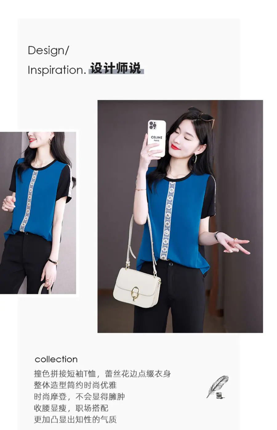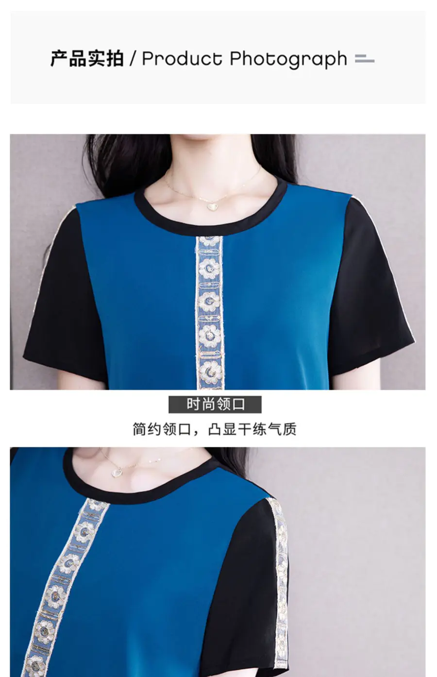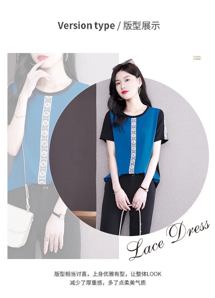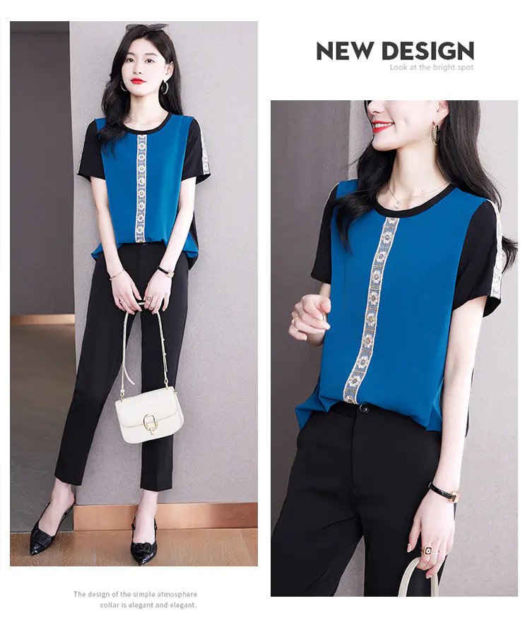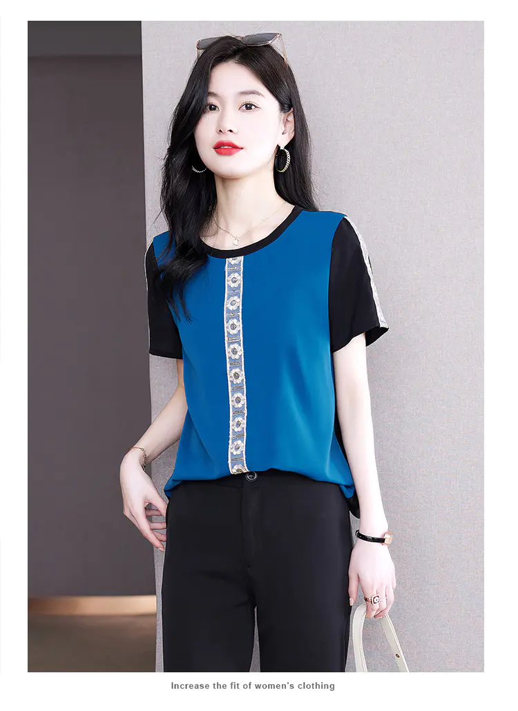 AHM-19573夏季新款时尚气质圆领撞色拼接宽松显瘦短袖T恤女