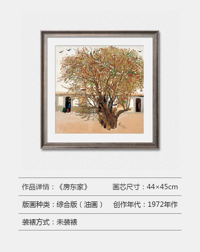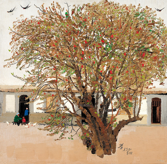 一排长方形的房屋对比了团状的花树。树之干枝交叉及红花绿叶之缠绵应是画面成败之要害。雪白的墙面与乌黑的门在构思中早就是关键性的因素,红绿相间的大片石榴花叶呈现“灰”之功效,总起来看,在色调中还是黑、白、灰之组合。