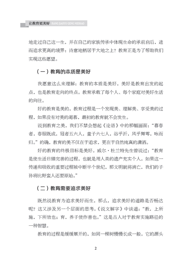 翻开这本《让教育更美好》,我们可以看到,美好学生、美好教师、美好家长、美好校园、美好课程、美好评价、美好治理、美好保障八个维度,虽不能涵盖美好教育的全部内涵,却能给读者带来全方位视角的启示。换言之,上城区的广大教育工作者在追寻美好教育道路上不仅有着开阔的视野,更有着一份教育的担当和情怀,而在追寻过程中表现出来的执着精神,更是让人心生敬意,为之动容。