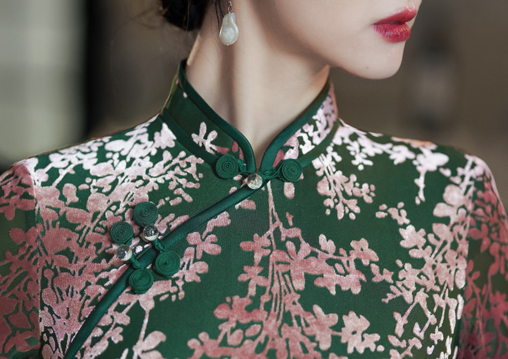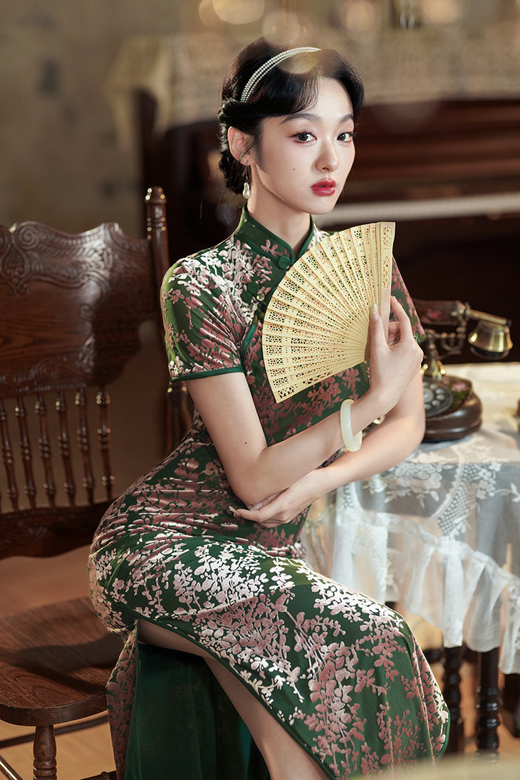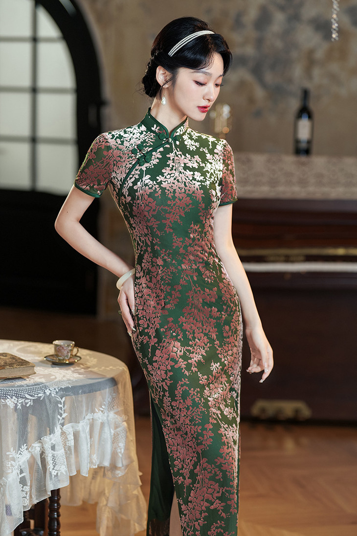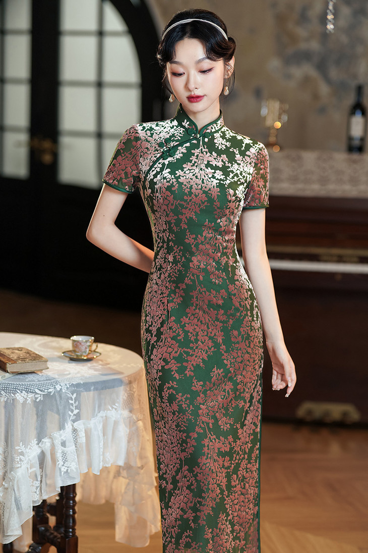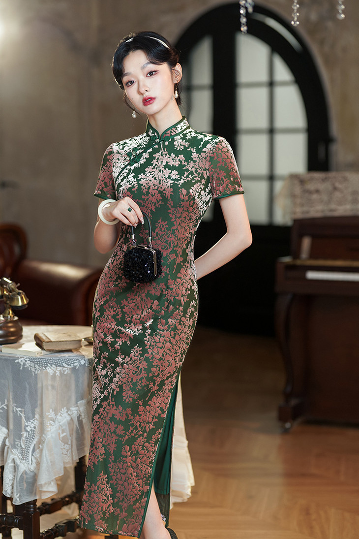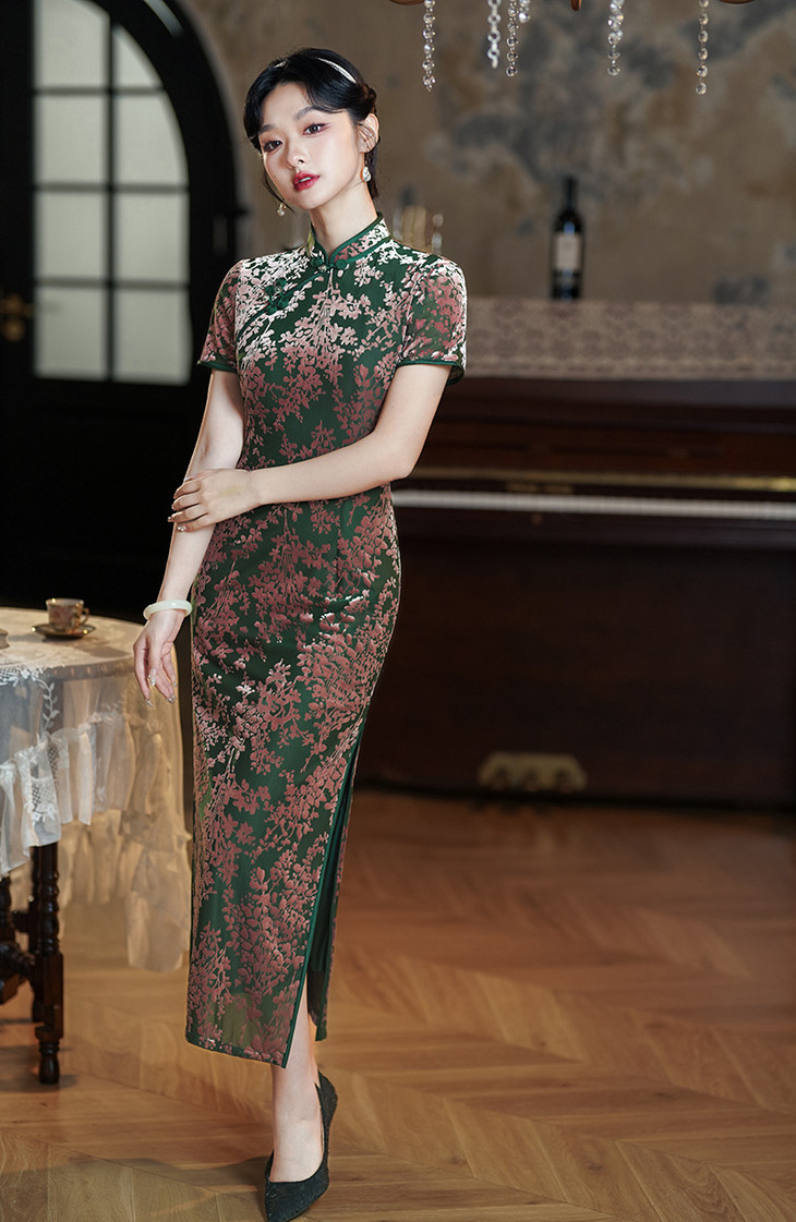 气质国风长款,短袖烧花绒改良旗袍XL1097
