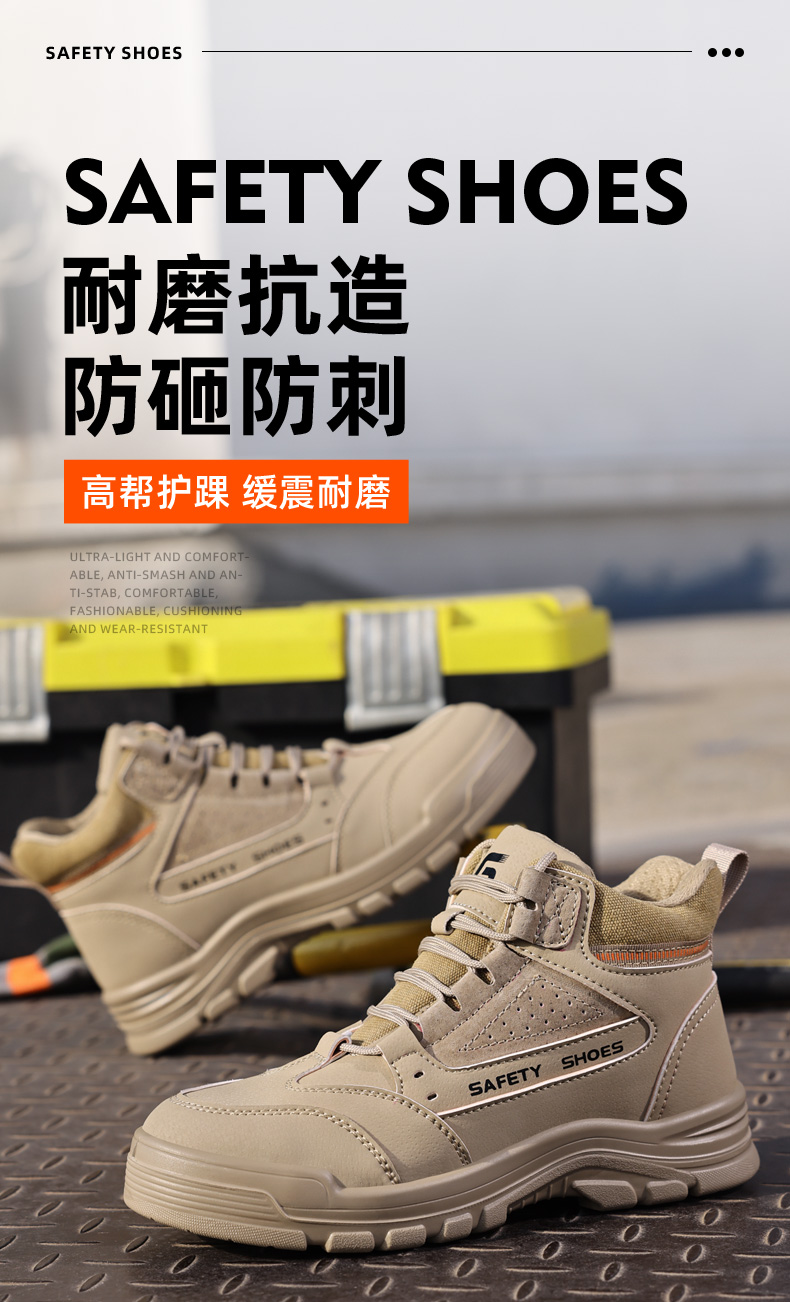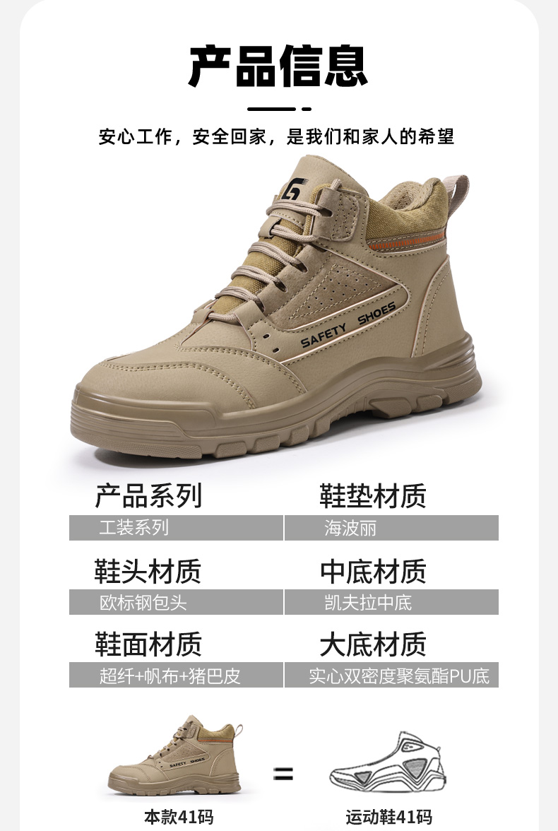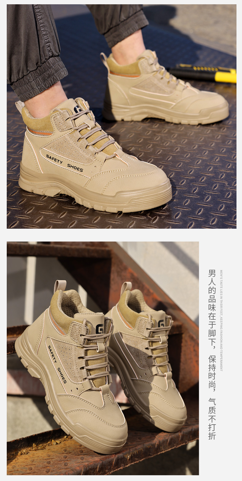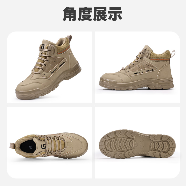 2025新款四季款劳保鞋防砸防刺穿欧标钢包头凯夫拉底实心底超纤帆布猪巴皮卡其高帮安全鞋