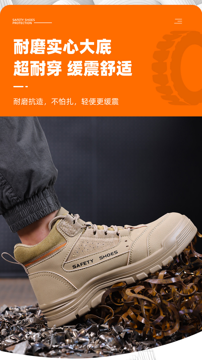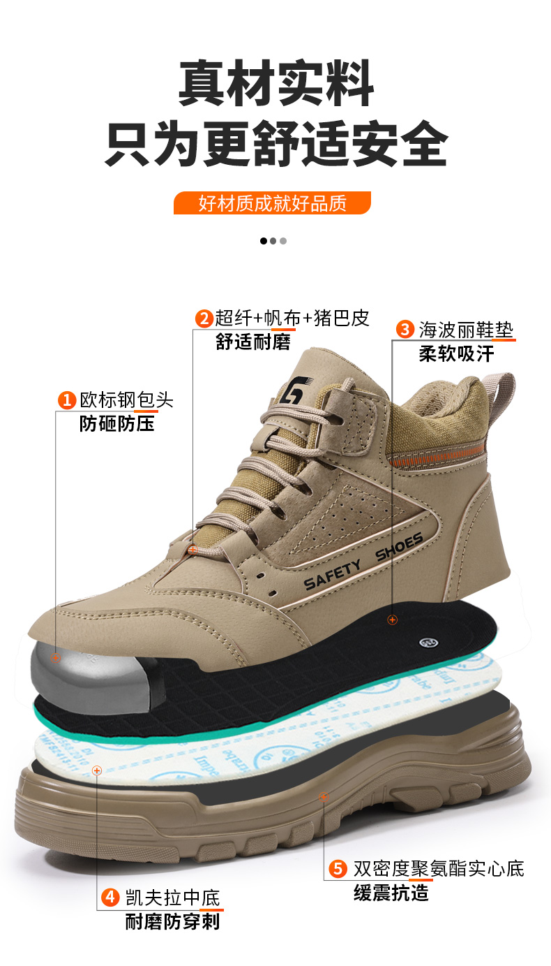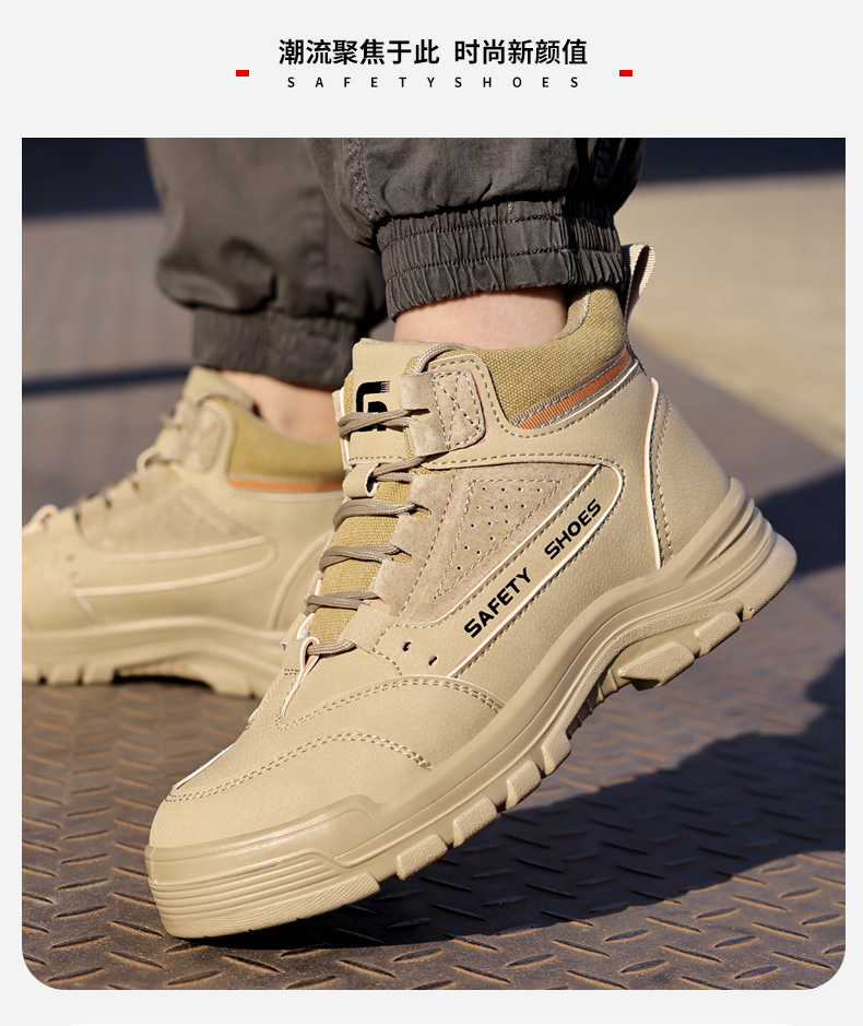 2025新款四季款劳保鞋防砸防刺穿欧标钢包头凯夫拉底实心底超纤帆布猪巴皮卡其高帮安全鞋