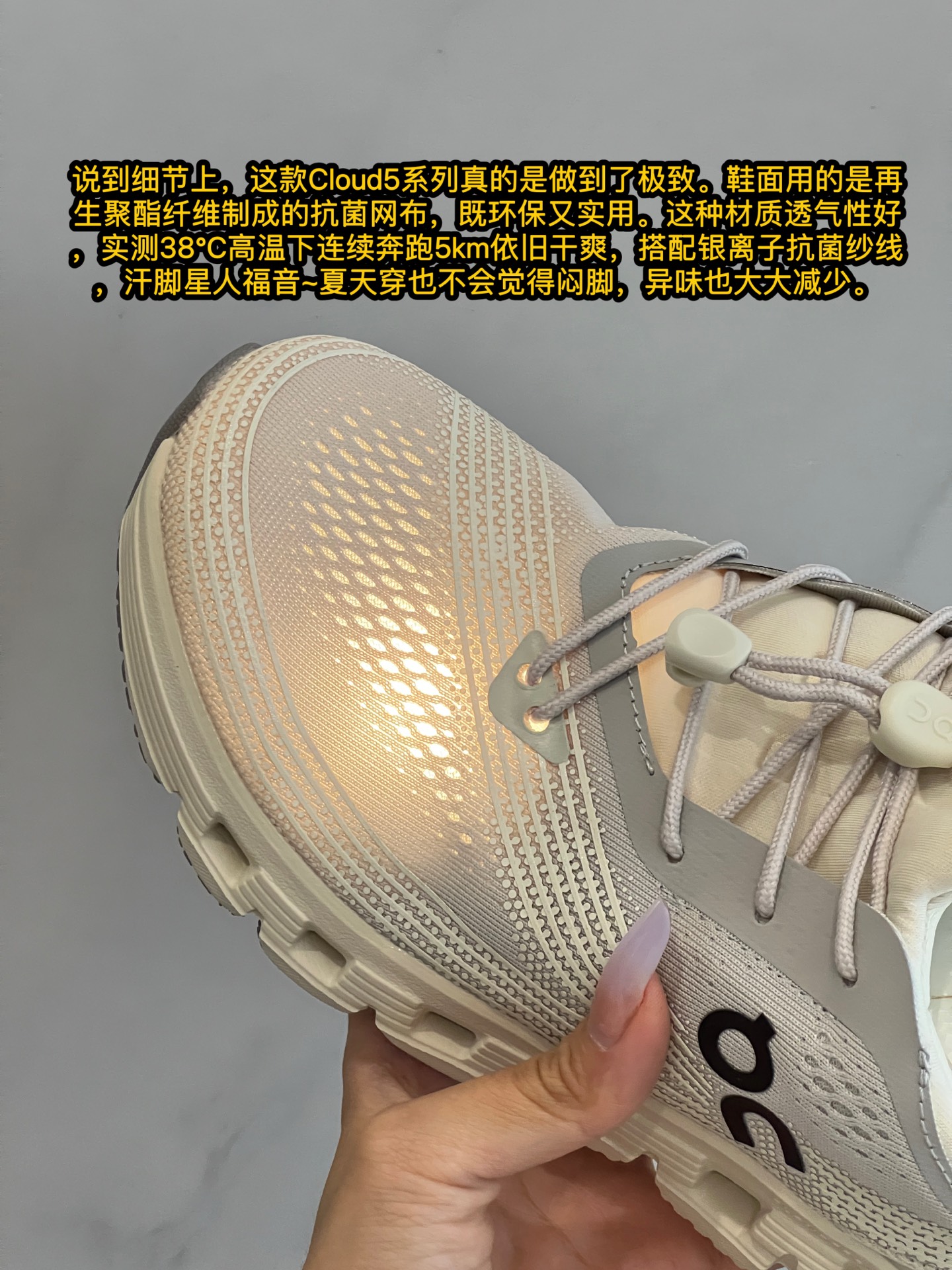 说到细节上,这款Cloud5系列真的是做到了极致。鞋面用的是再生聚酯纤维制成的抗菌网布,既环保又实用。这种材质透气性好,实测38℃高温下连续奔跑5km依旧干爽,搭配银离子抗菌纱线,汗脚星人福音~夏天穿也不会觉得闷脚,异味也大大减少。