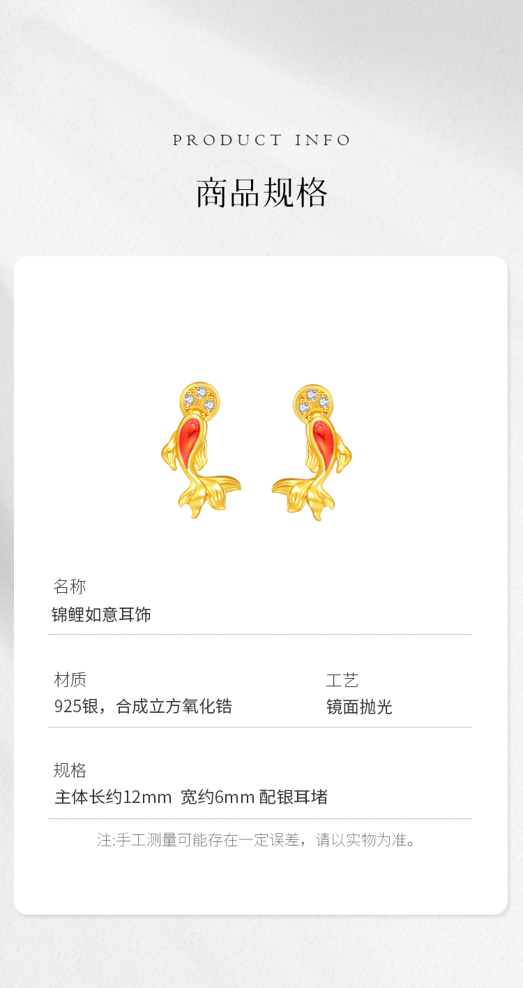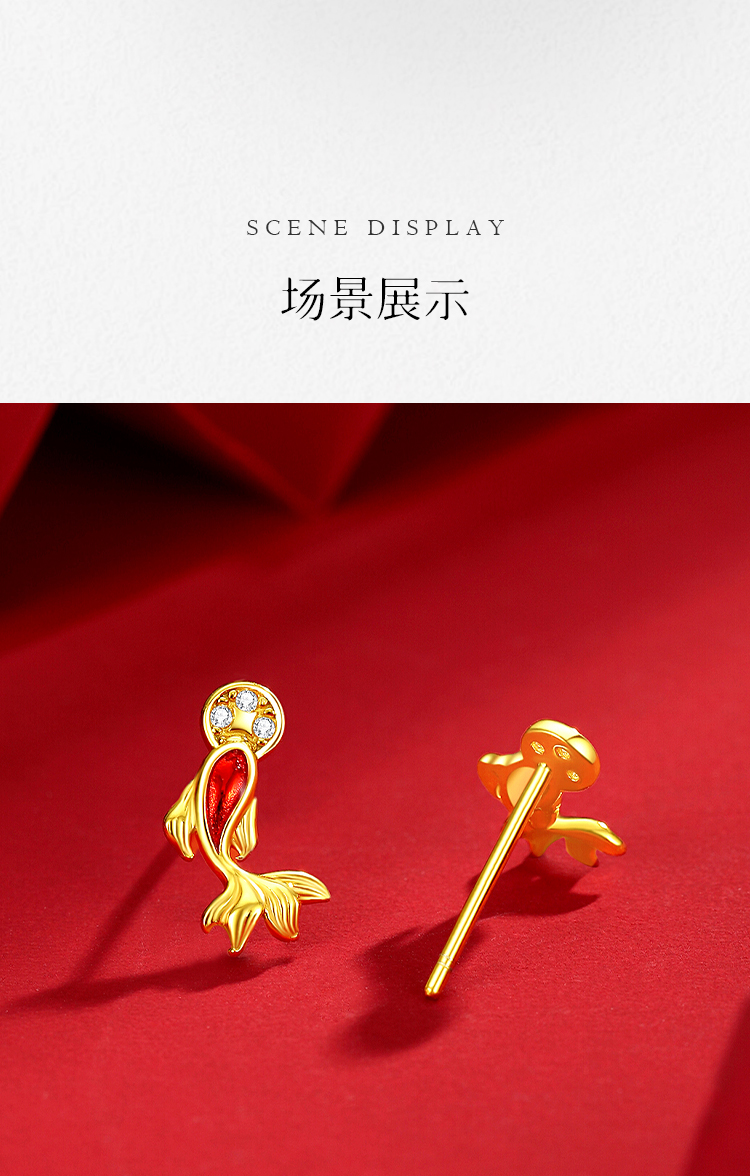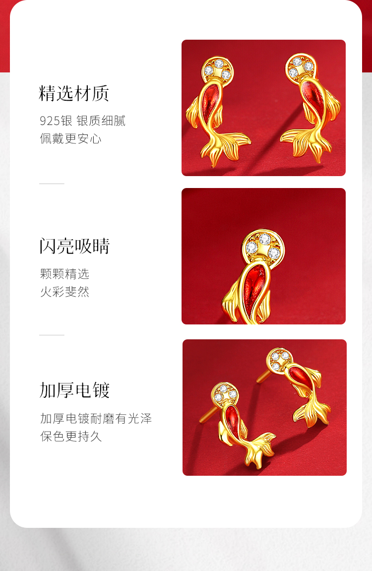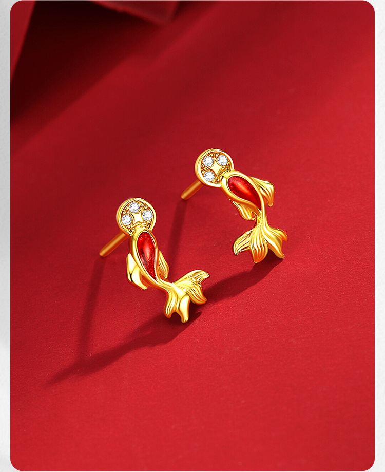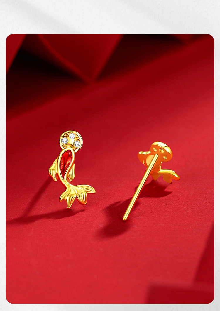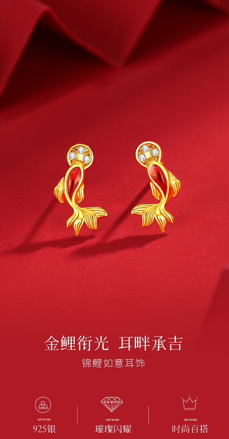 Winy S925 银镀金锦鲤如意耳饰 滴胶工艺镶合成立方氧化锆 新年好运耳钉