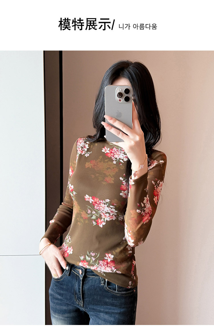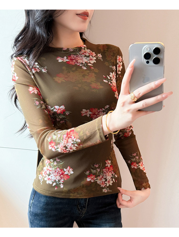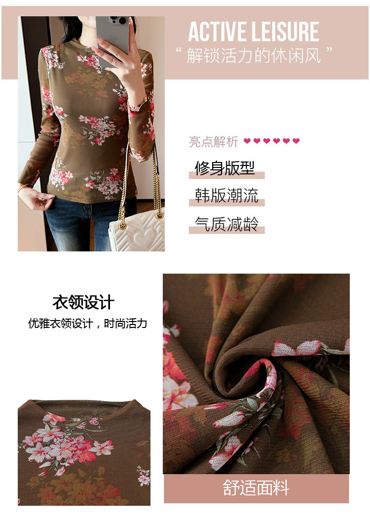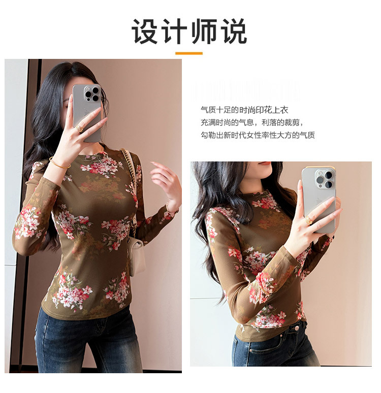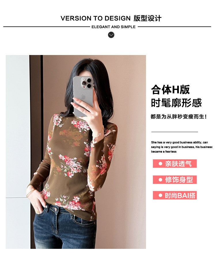 KQL A55F8716时尚洋气高弹网长袖T恤印花高领上衣