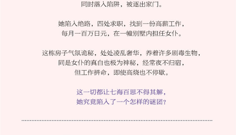 无处可去的七海四处求职,找到一份高薪工作,每月一日元,在一幢别墅内担任女仆。这栋房子极为诡异,处处凌乱奢华,养着许多剧毒生物。同是女仆的真白也极为神秘,经常夜不归宿,但工作拼命,即使高烧也不停歇。