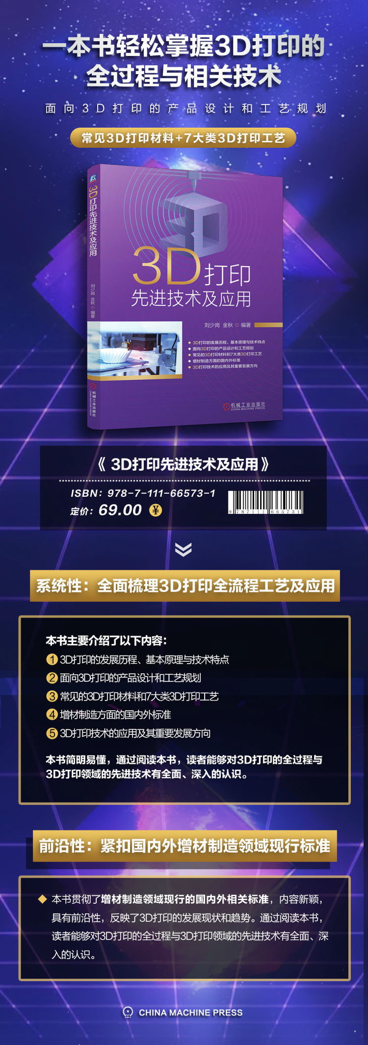 3D打印是通过逐层堆积形成三维实体的先进制造技术,也称为增材制造。由于3D打印技术在个性化制造和复杂零部件制造等方面具有独特的优势,所以3D打印技术正在对传统制造工艺流程和生产模式产生日益重要的影响,并受到了各国政府和各行各业的高度重视。经过三十多年的发展,3D打印的新工艺和新装备不断出现,3D打印材料种类不断增加,应用领域不断拓宽。为了使读者掌握3D打印领域的先进技术和最新发展情况,我们在综合国内外相关研究成果和产业发展现况的基础上编写了本书。