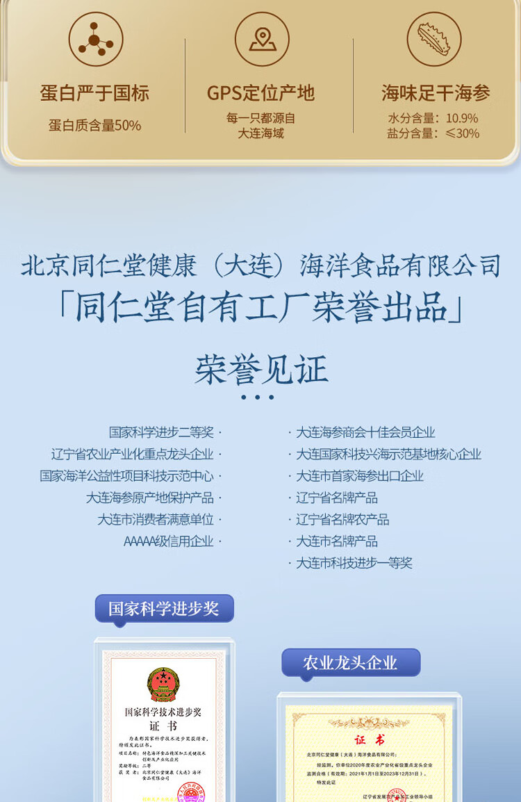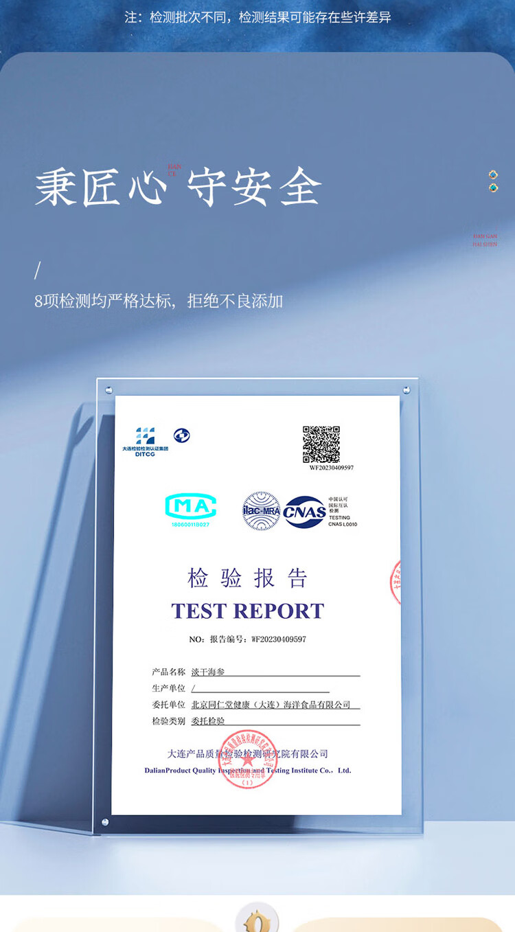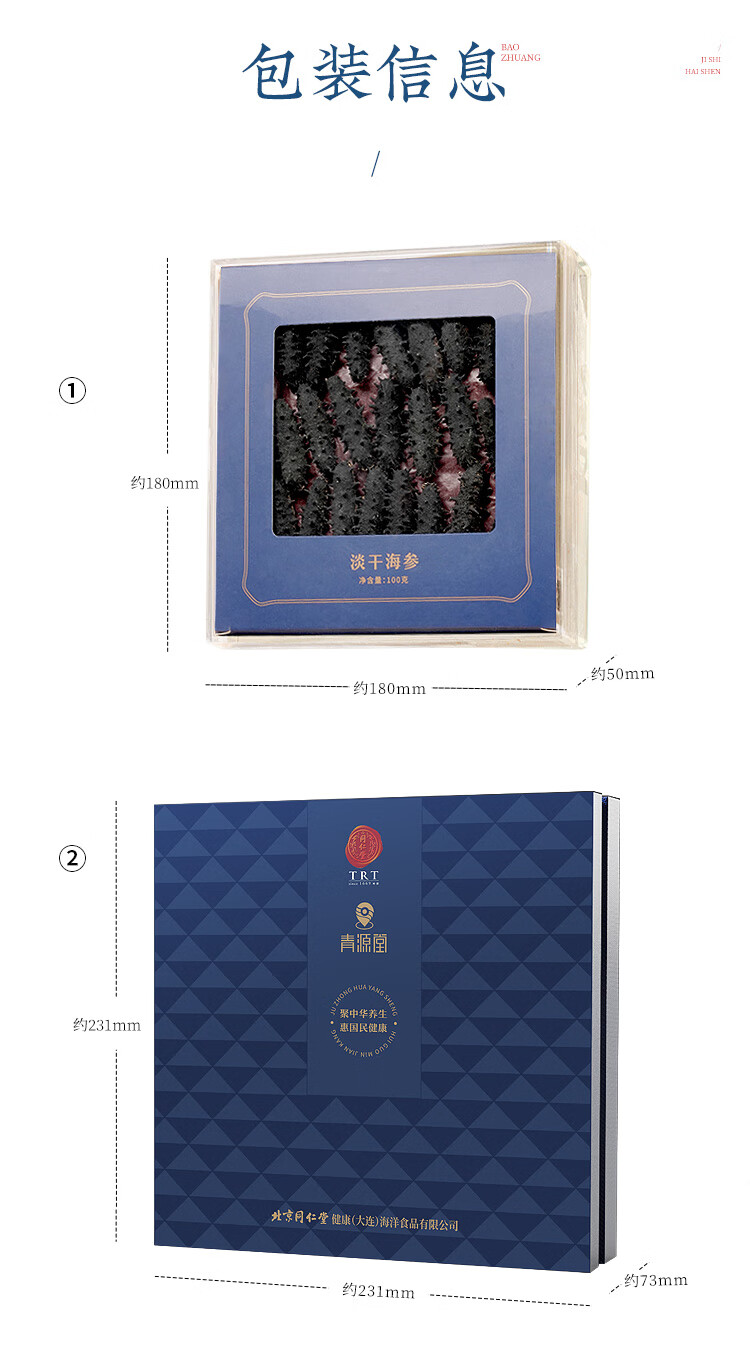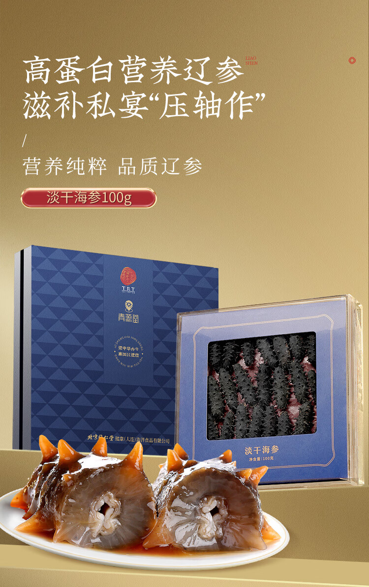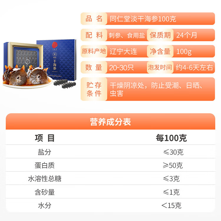 【正宗同仁堂品牌】北京同仁堂(TRT) 青源堂淡干海参100g(20-30只) 大连辽刺参SY