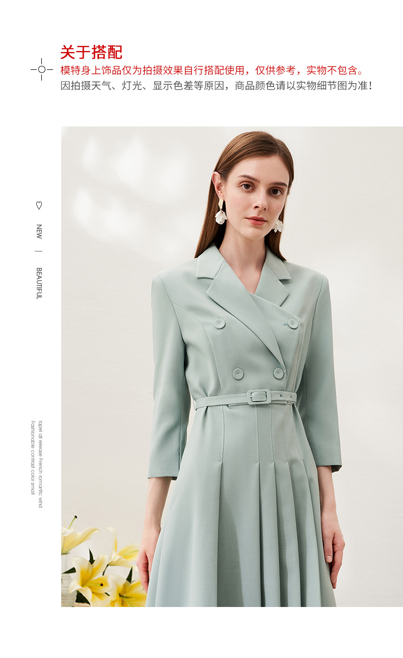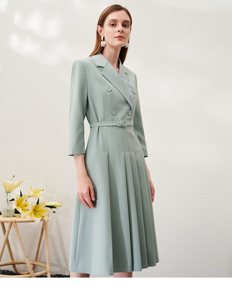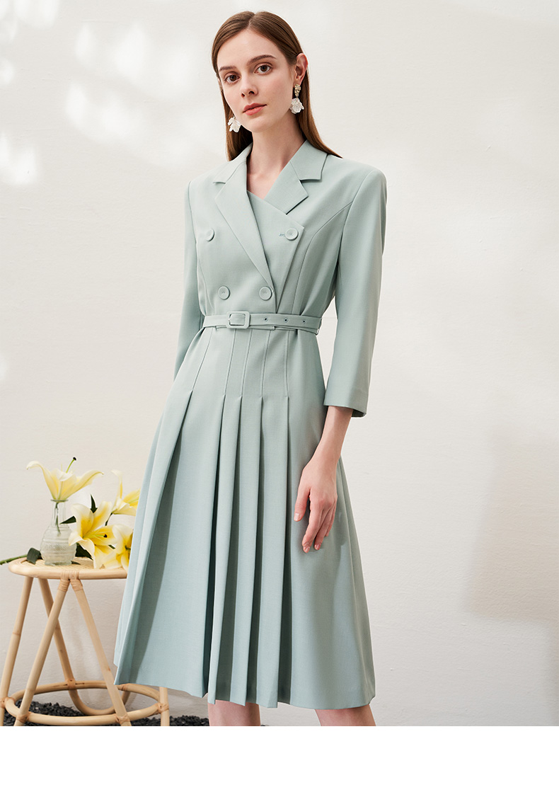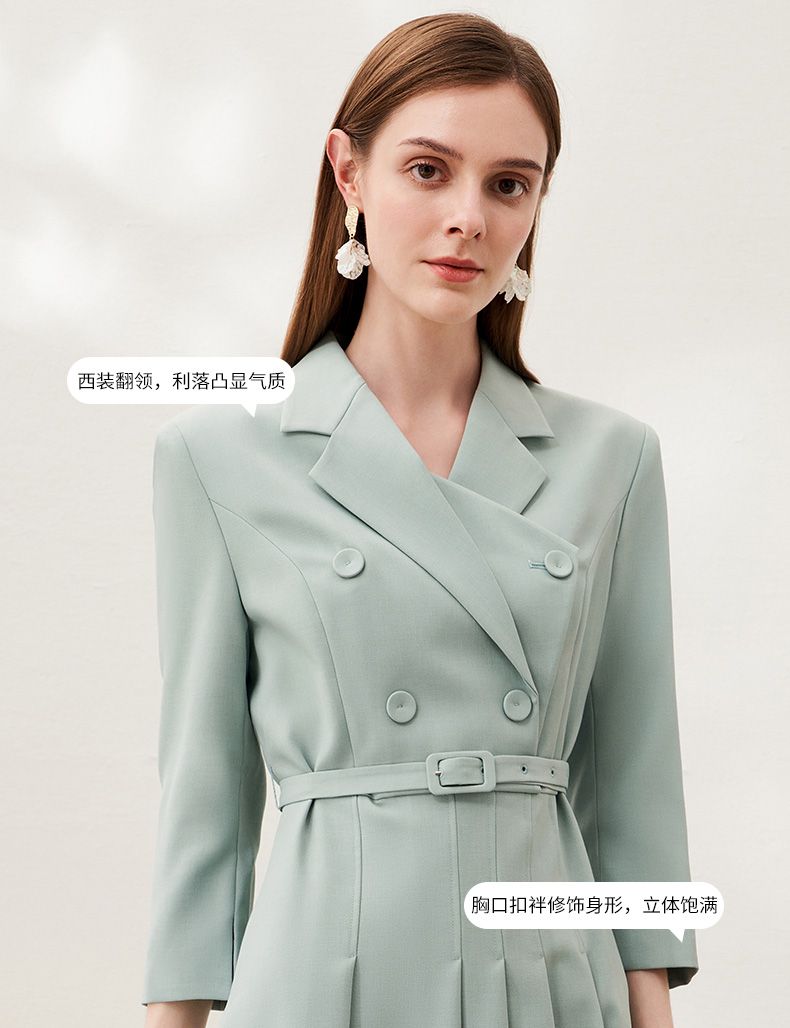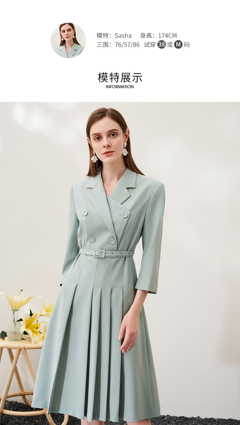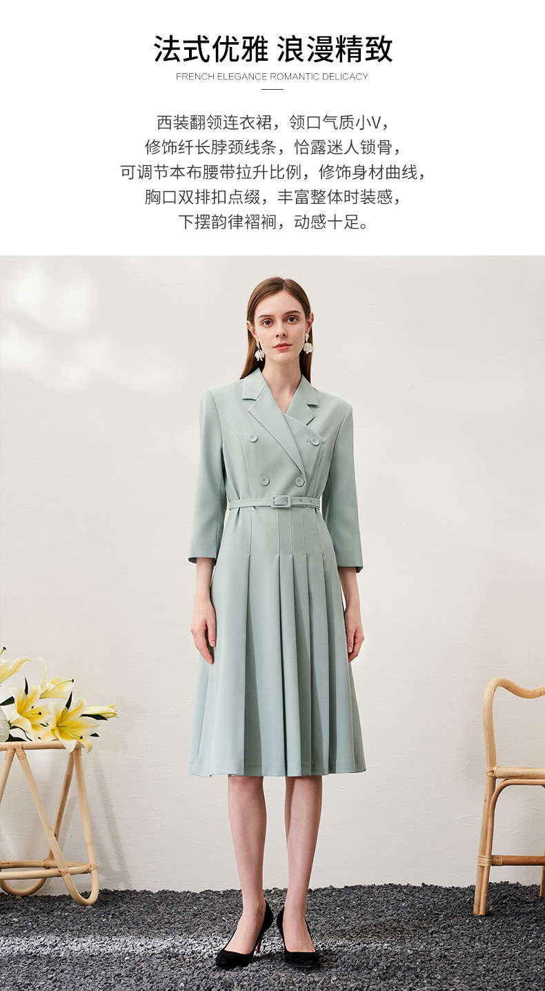 EITIE爱特爱春季新品西装V领优雅束腰显瘦百褶连衣裙6907624