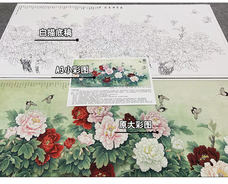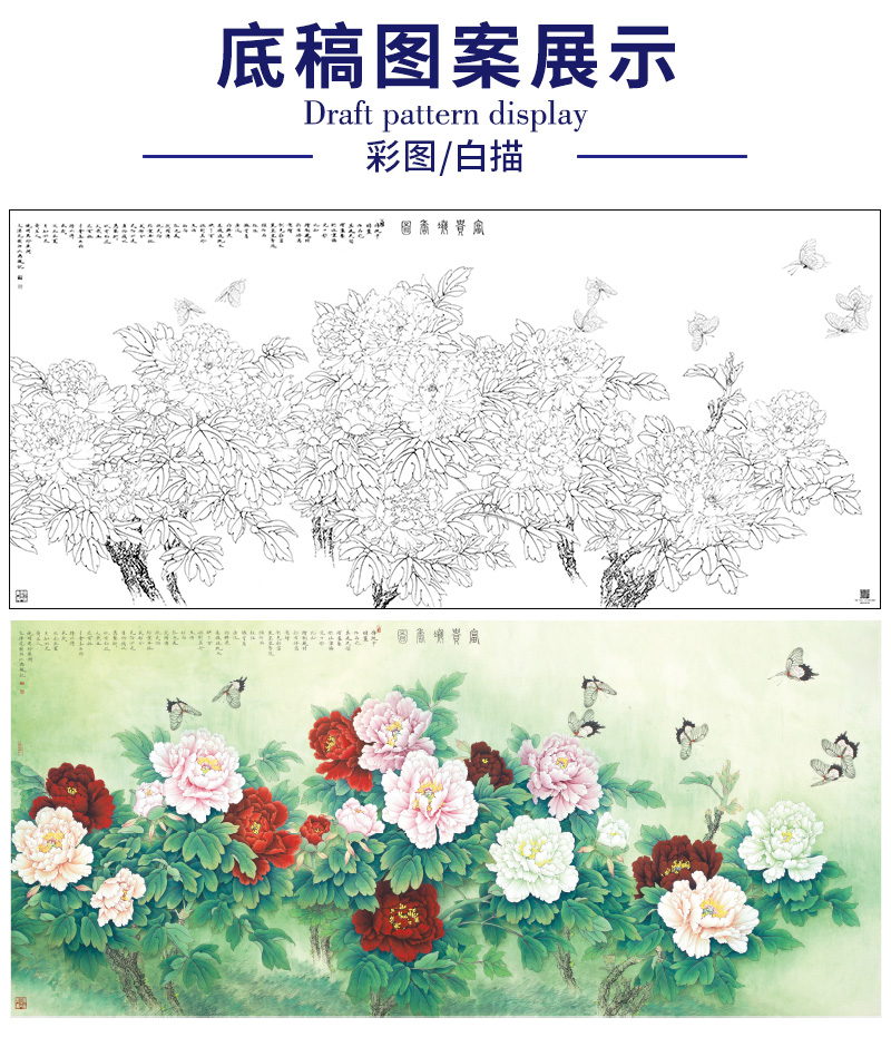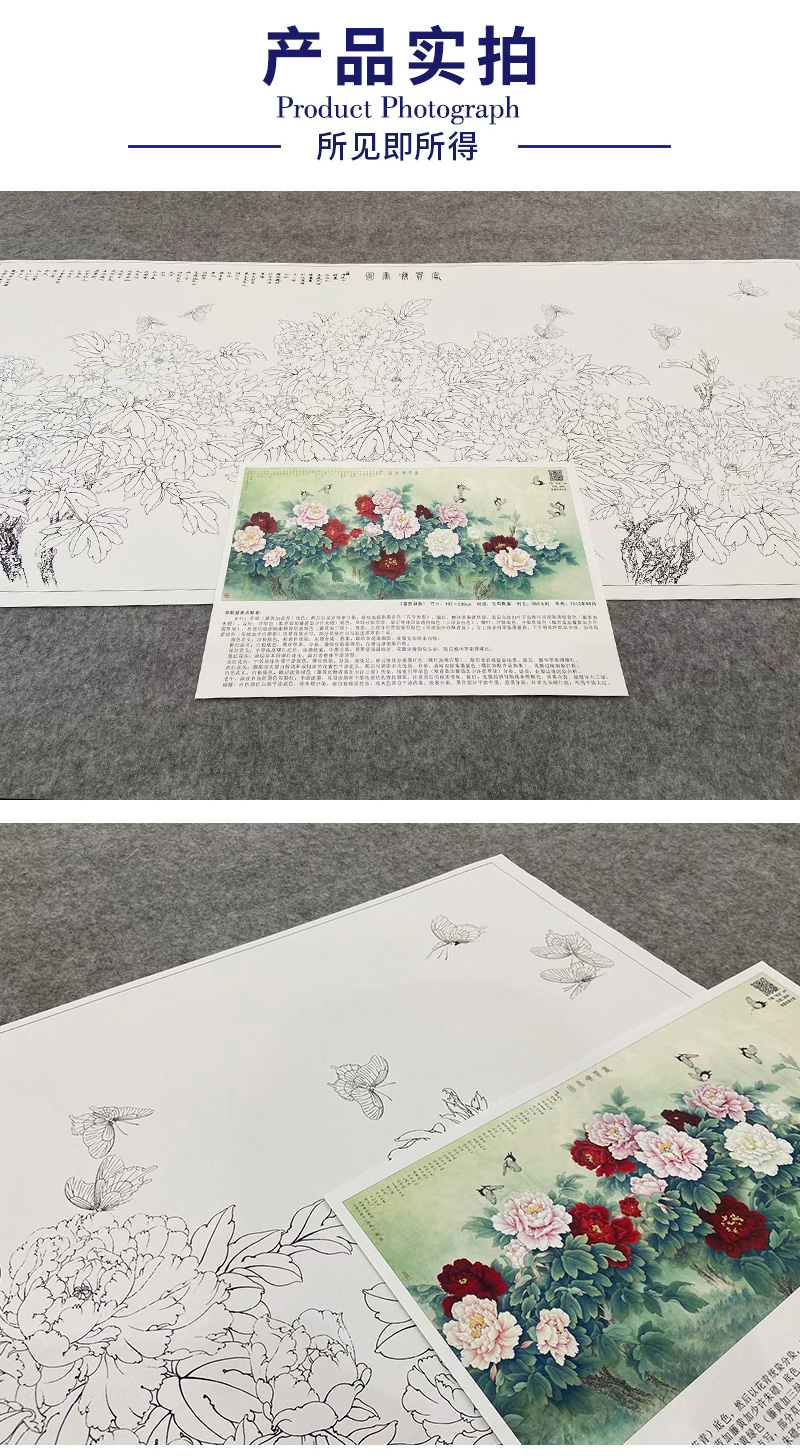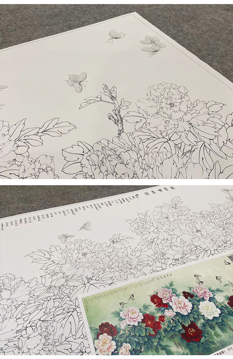 【大彩图】李晓明横幅工笔画白描底稿《富贵凝香图》牡丹临摹勾线花鸟线稿KA21