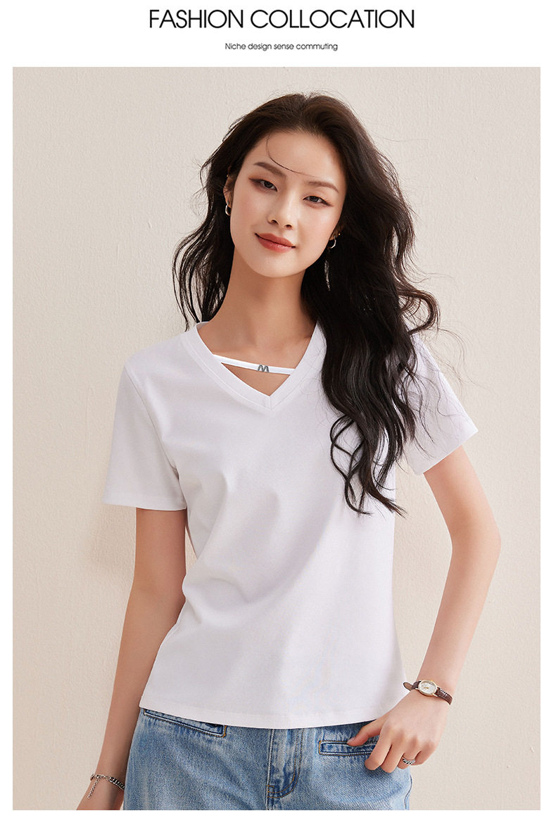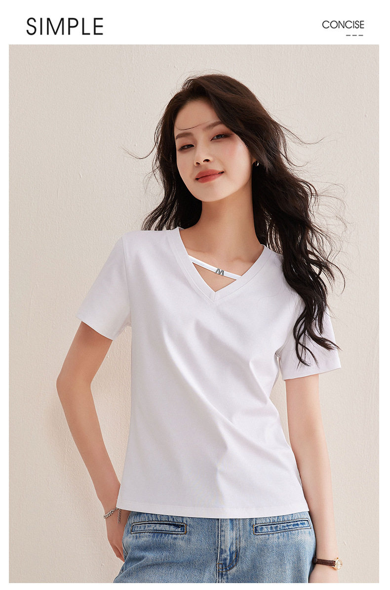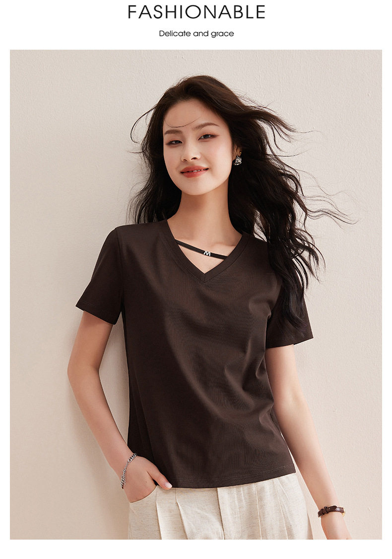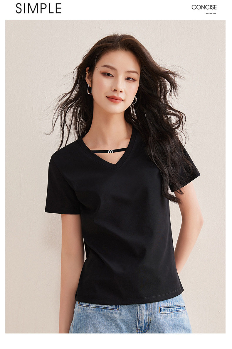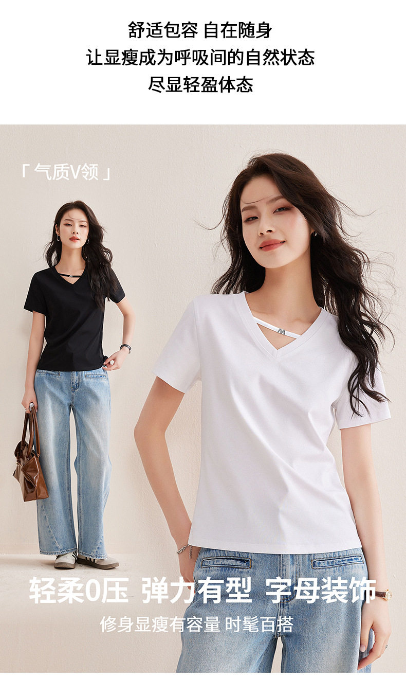 「自j」全新升级【铂金会员128/天猫169/差价41】(72818)洛诗琳气质V领短袖上衣女2026夏季新款短款收腰正肩T恤女