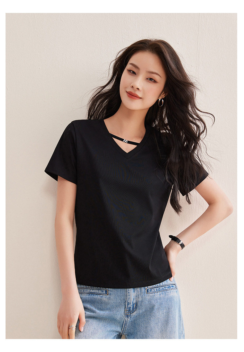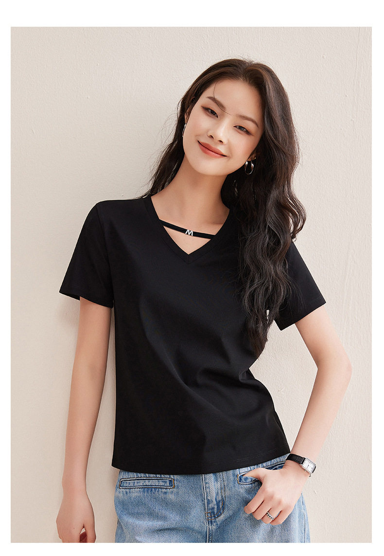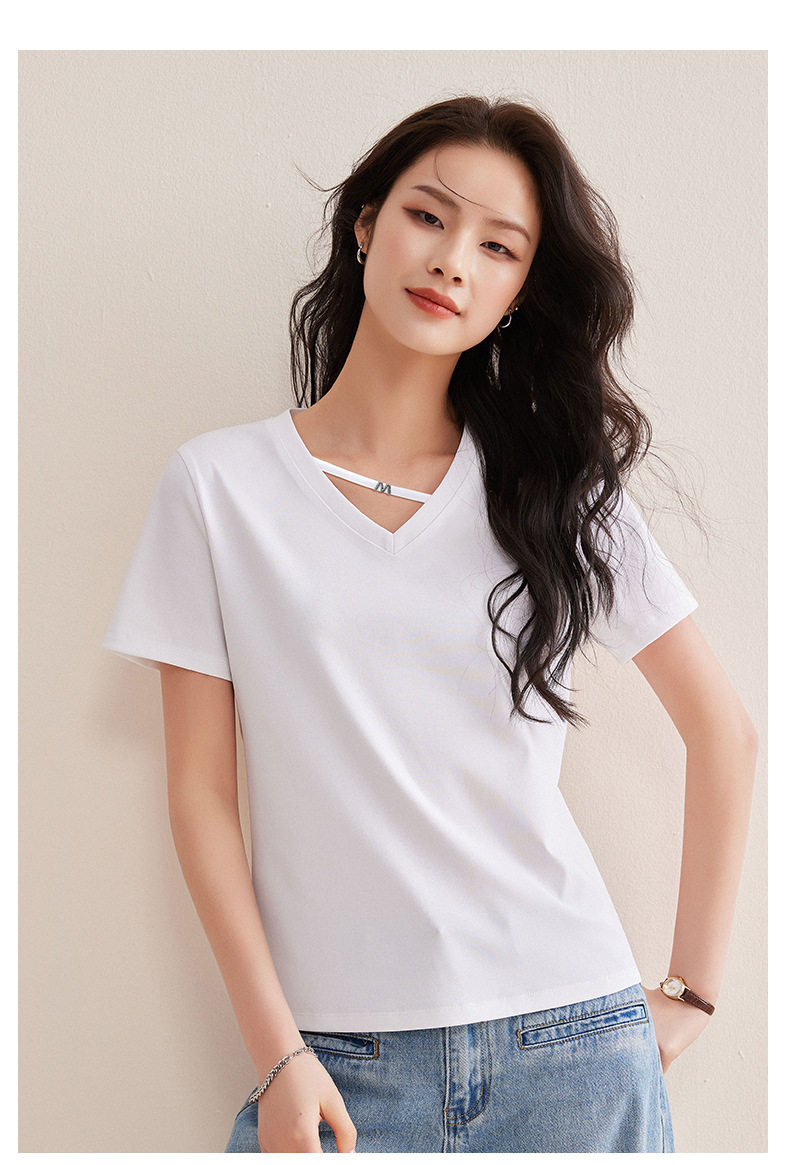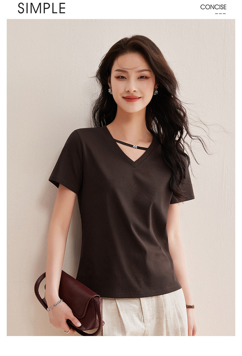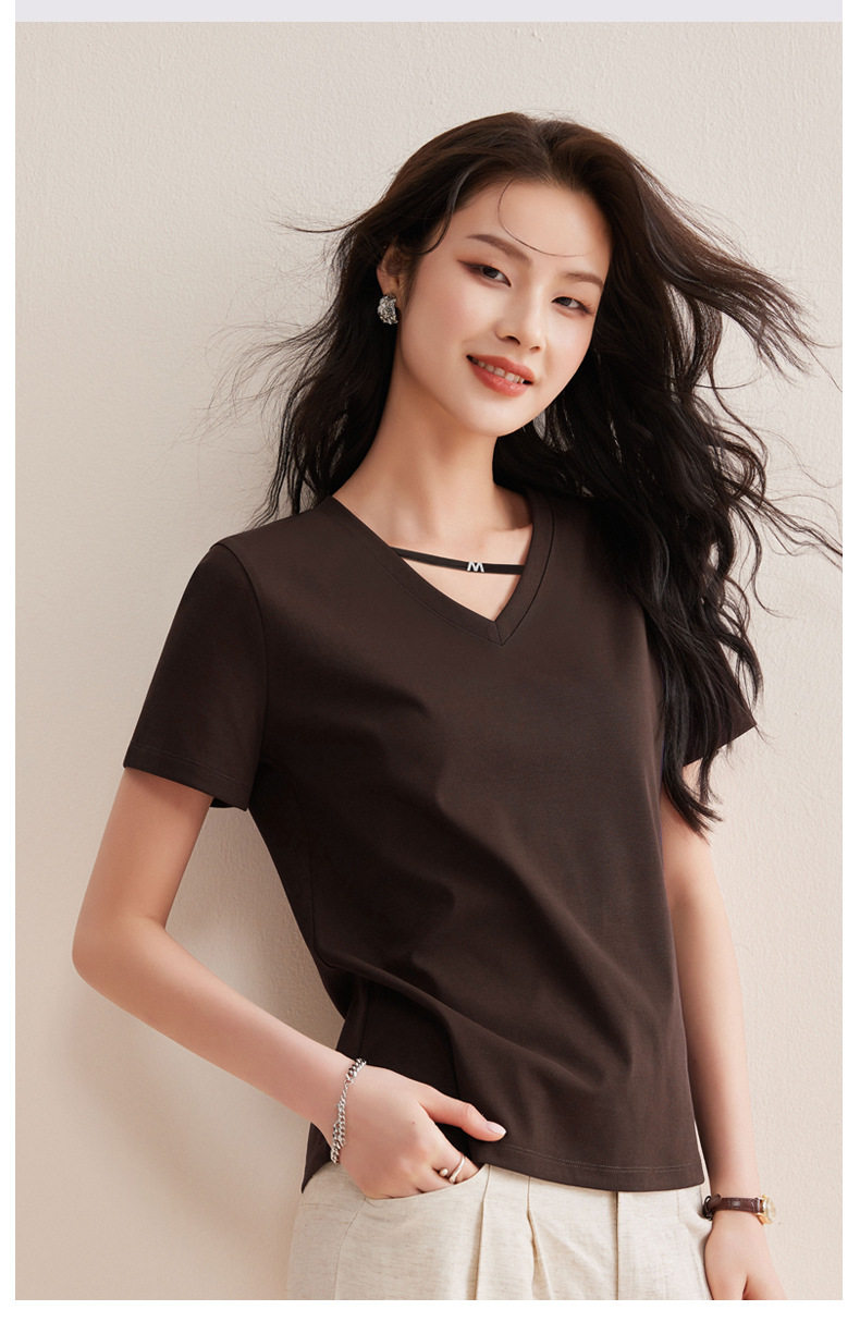 「自j」全新升级【铂金会员128/天猫169/差价41】(72818)洛诗琳气质V领短袖上衣女2026夏季新款短款收腰正肩T恤女