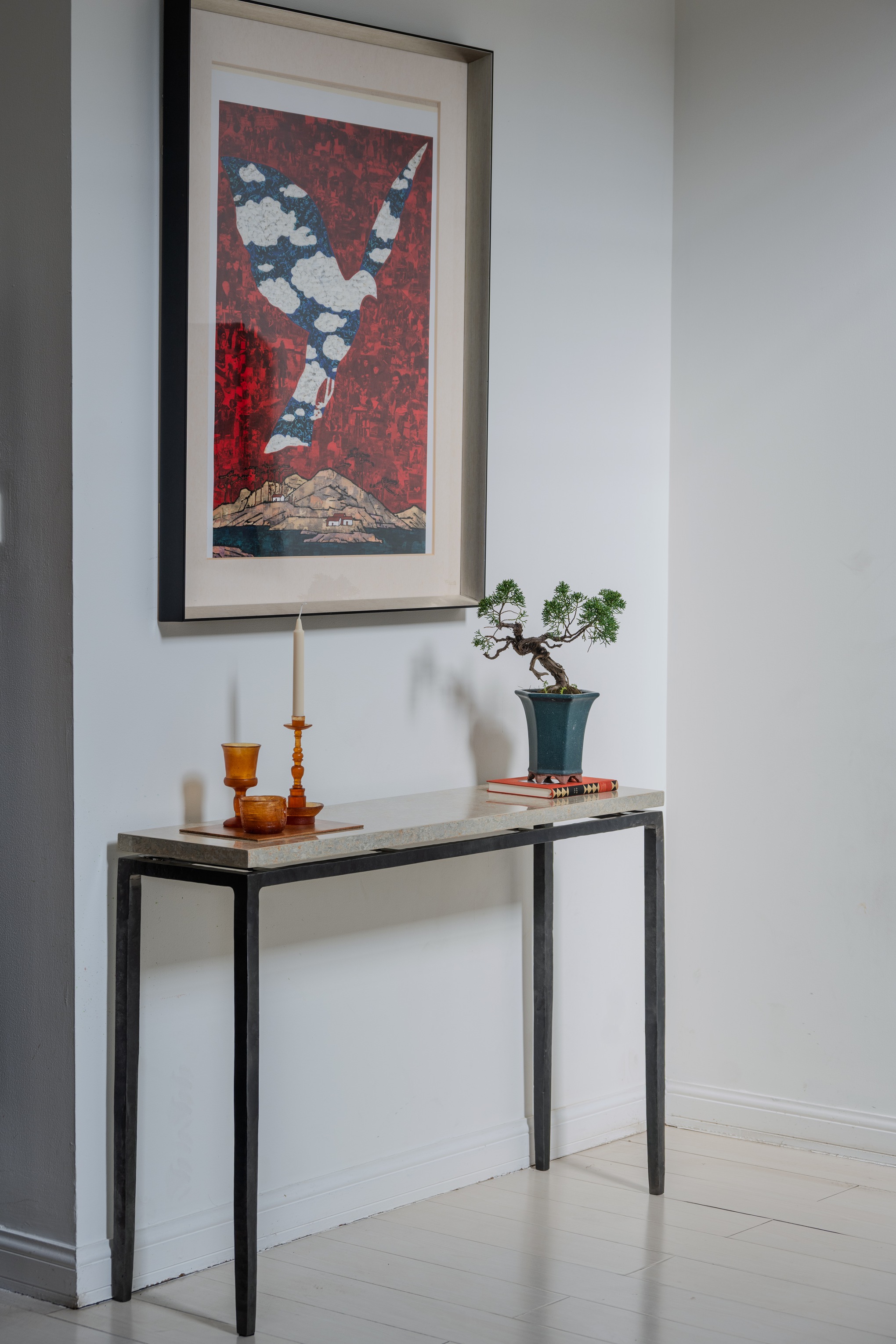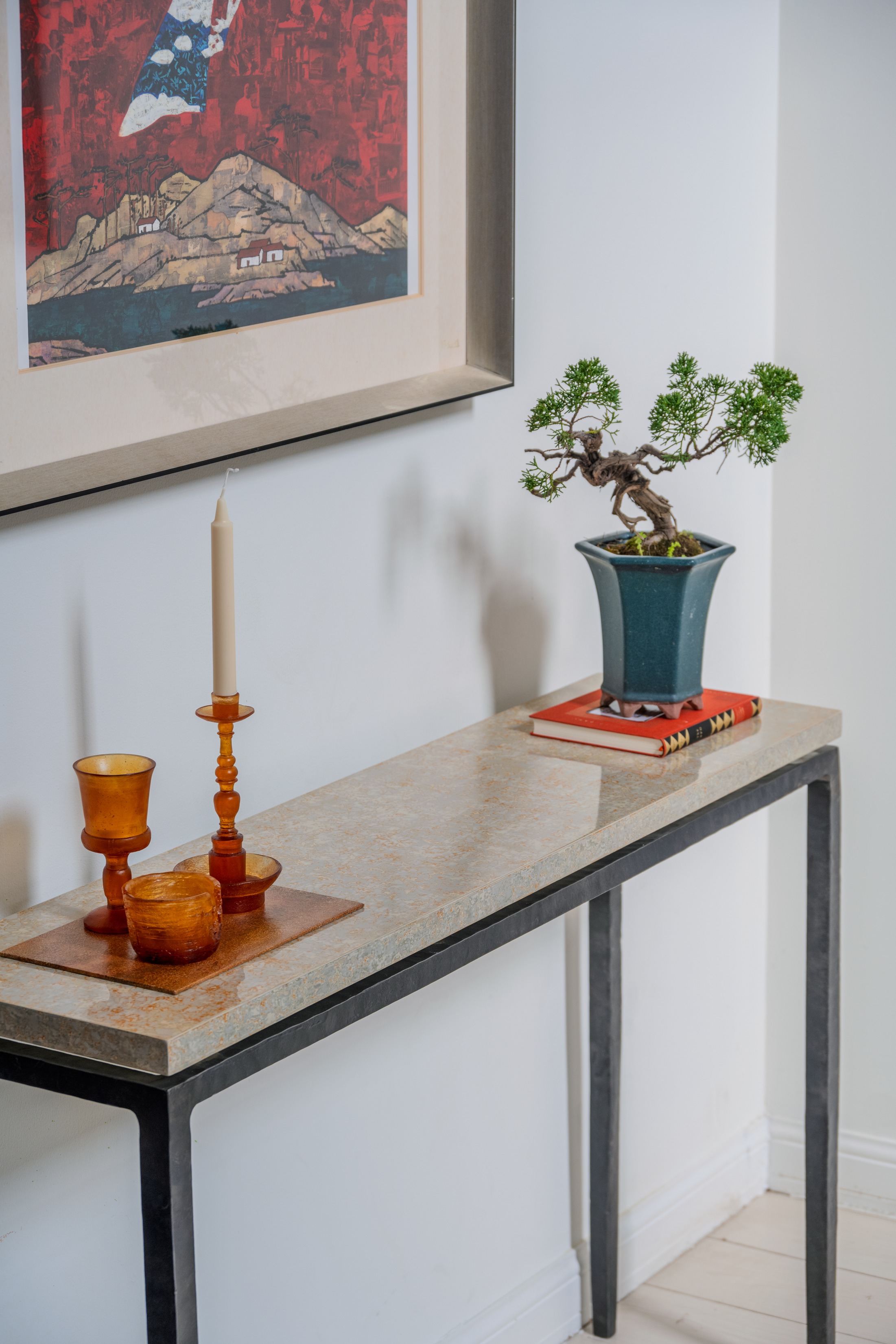 形制取宋明条案的清雅风骨,化繁为简。线条凝练利落,转折处多以方折勾勒,劲力内敛,清瘦挺拔,风骨卓然。既得明式家具的比例与气韵之美,亦契合现代空间的疏朗与简约气质。