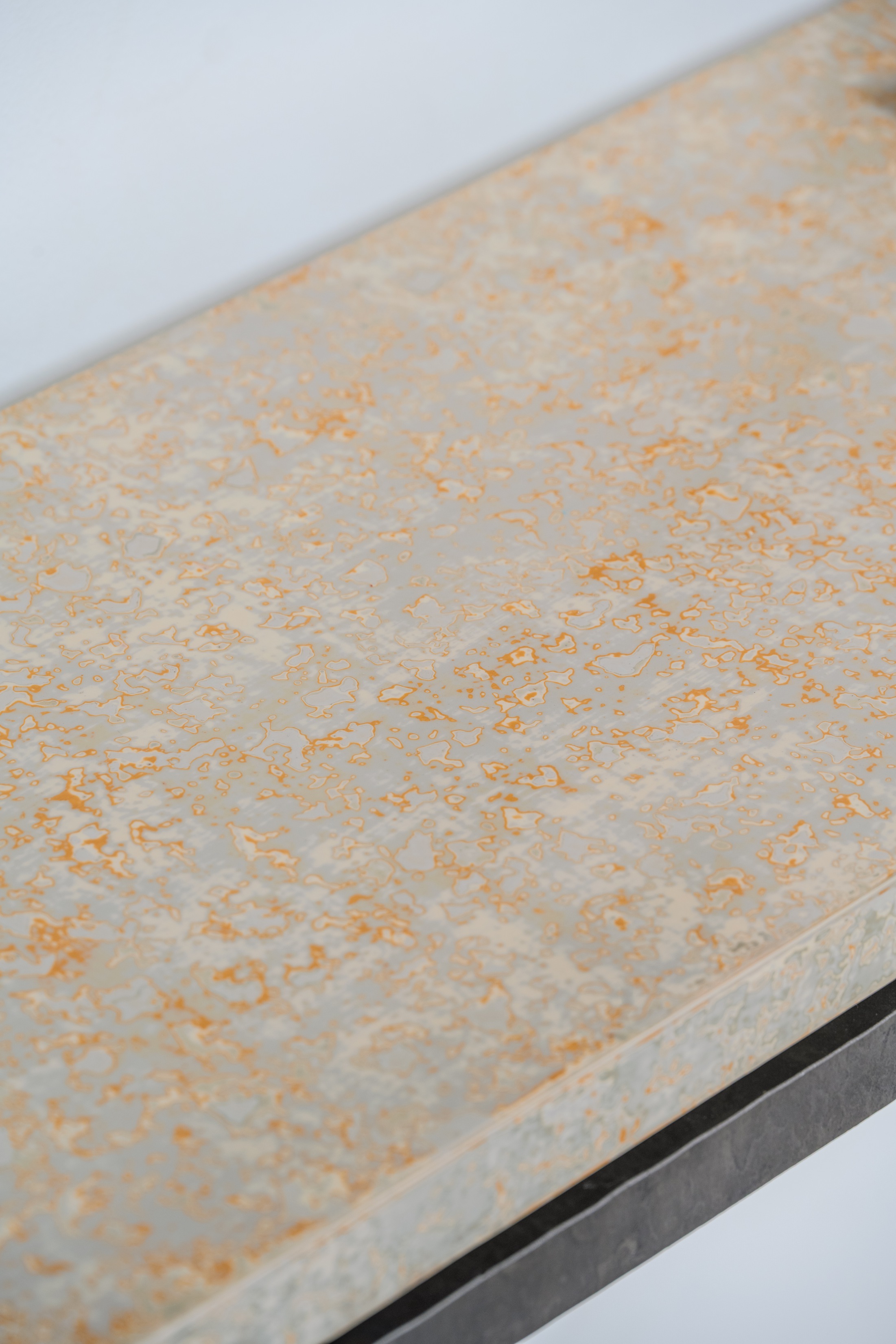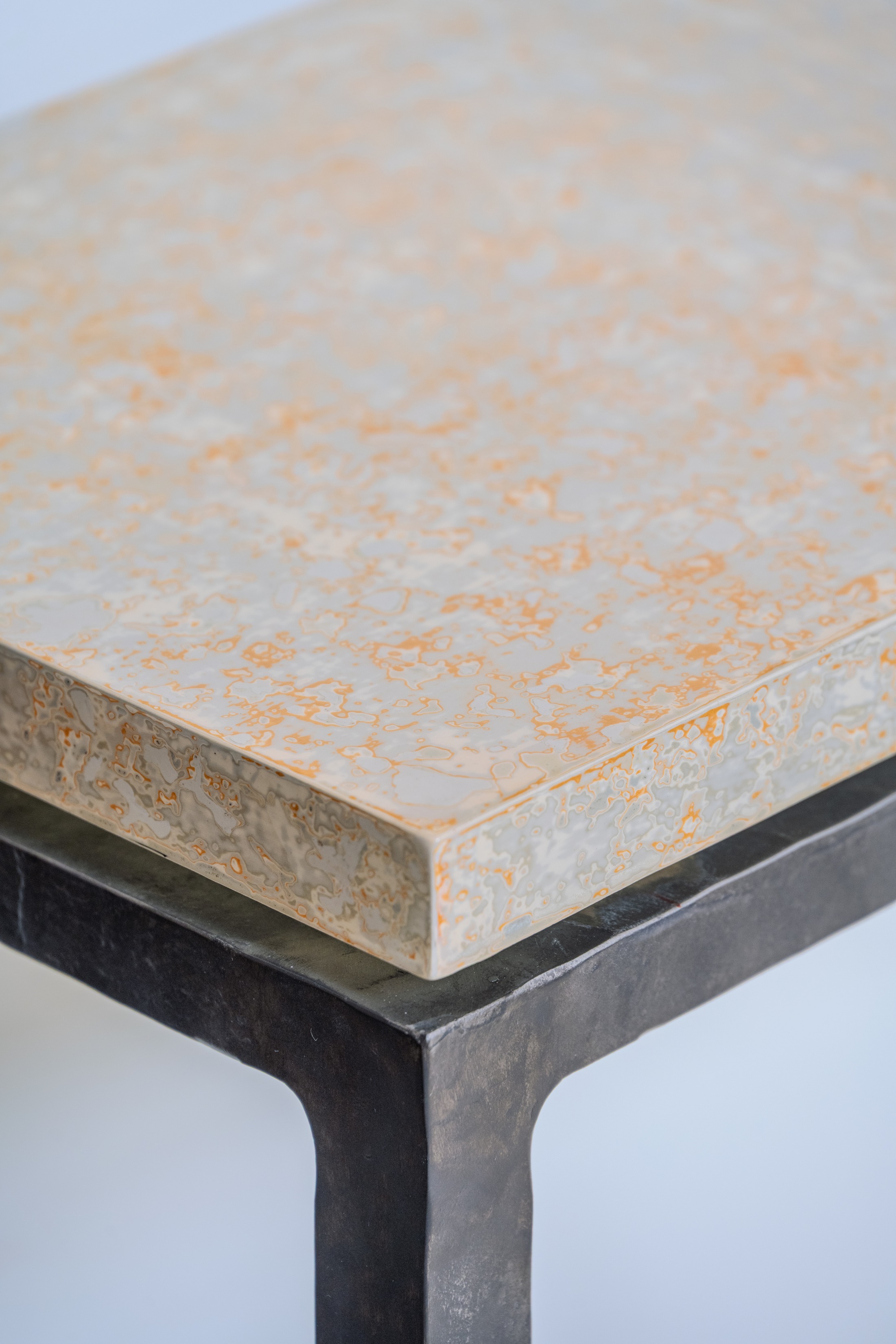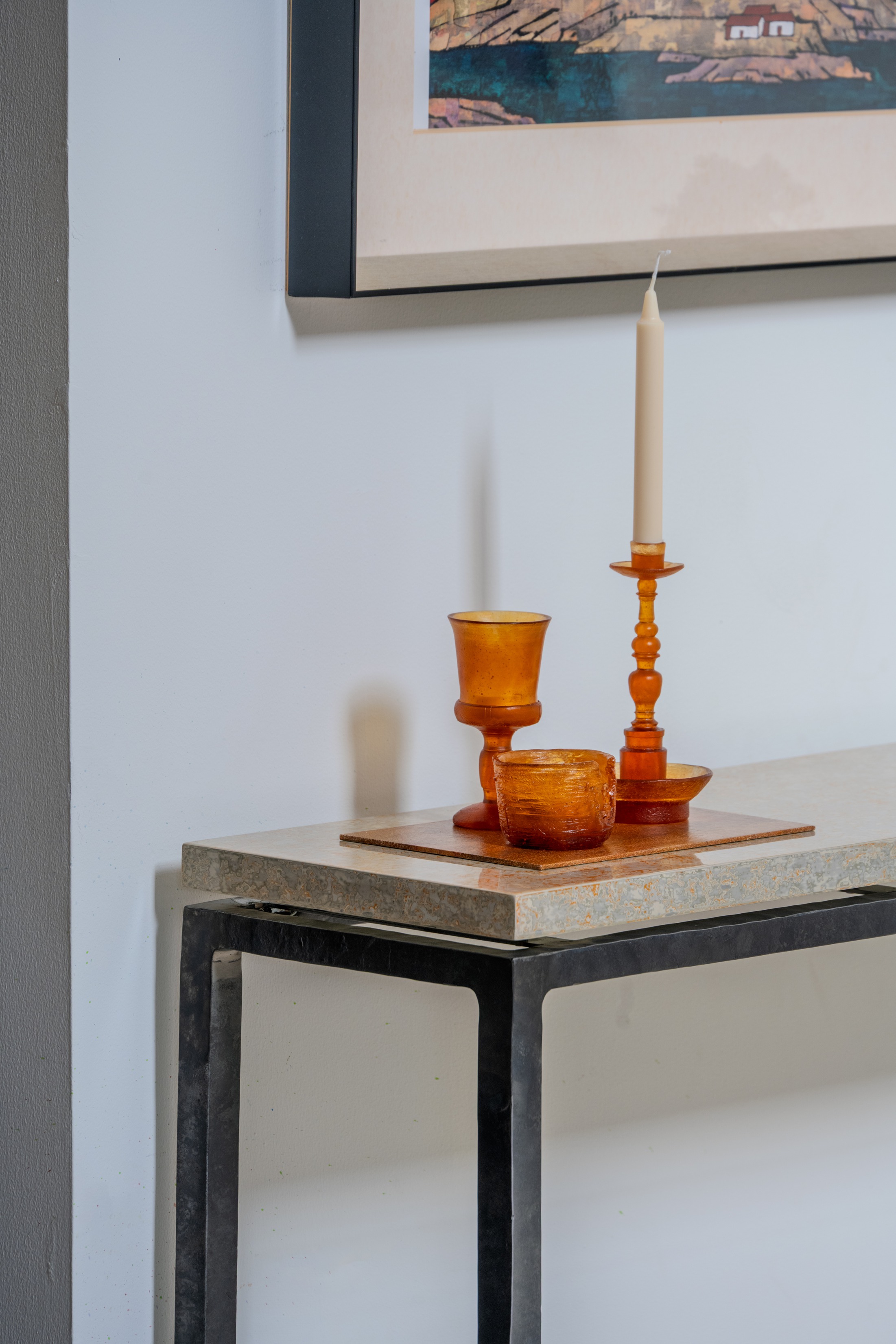 腿足采用手工锻打金属,表面保留着自然的捶打肌理,与温润漆面形成有趣对比——刚与柔、暖与冷、手作的温度与结构的理性,在碰撞中达成平衡。