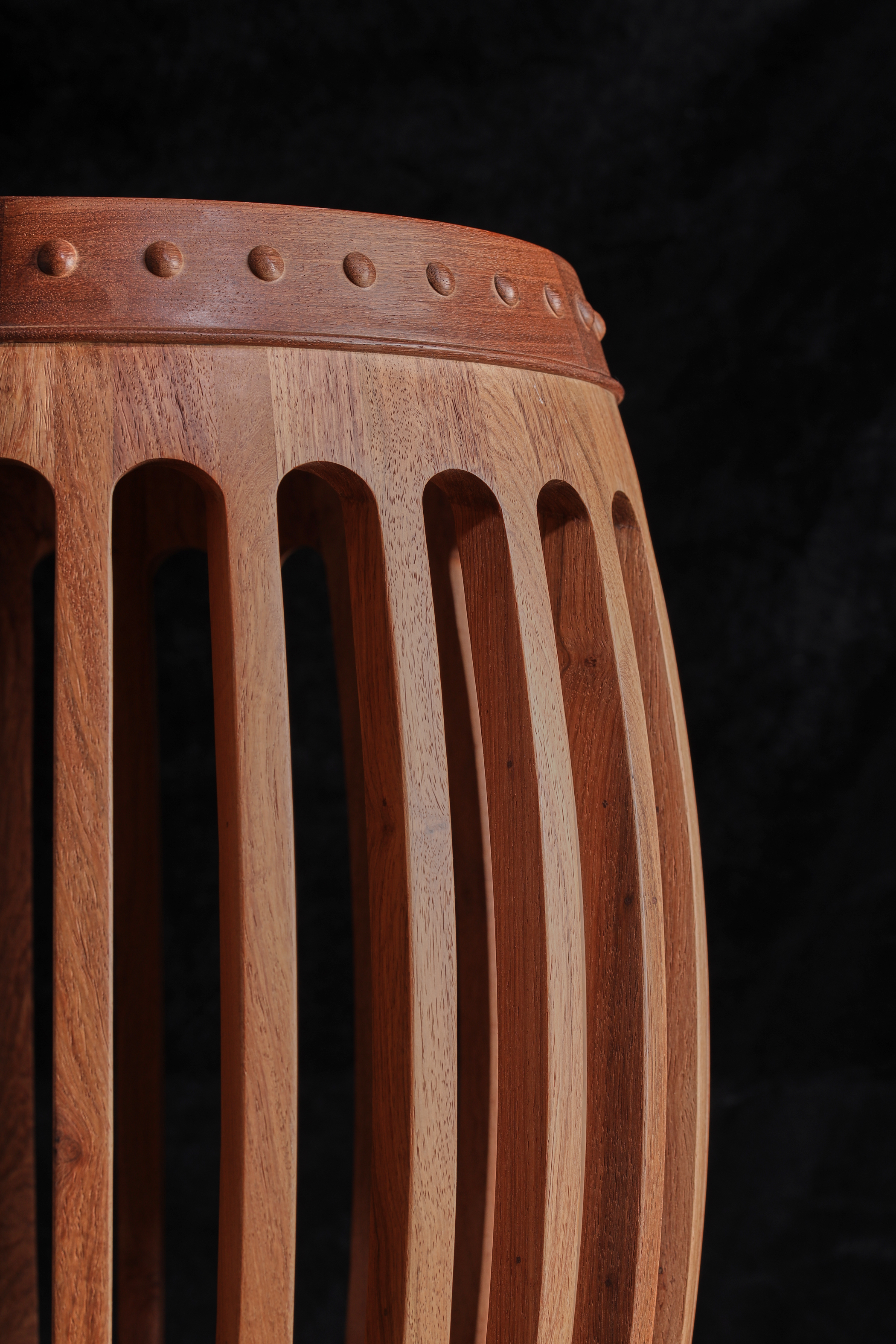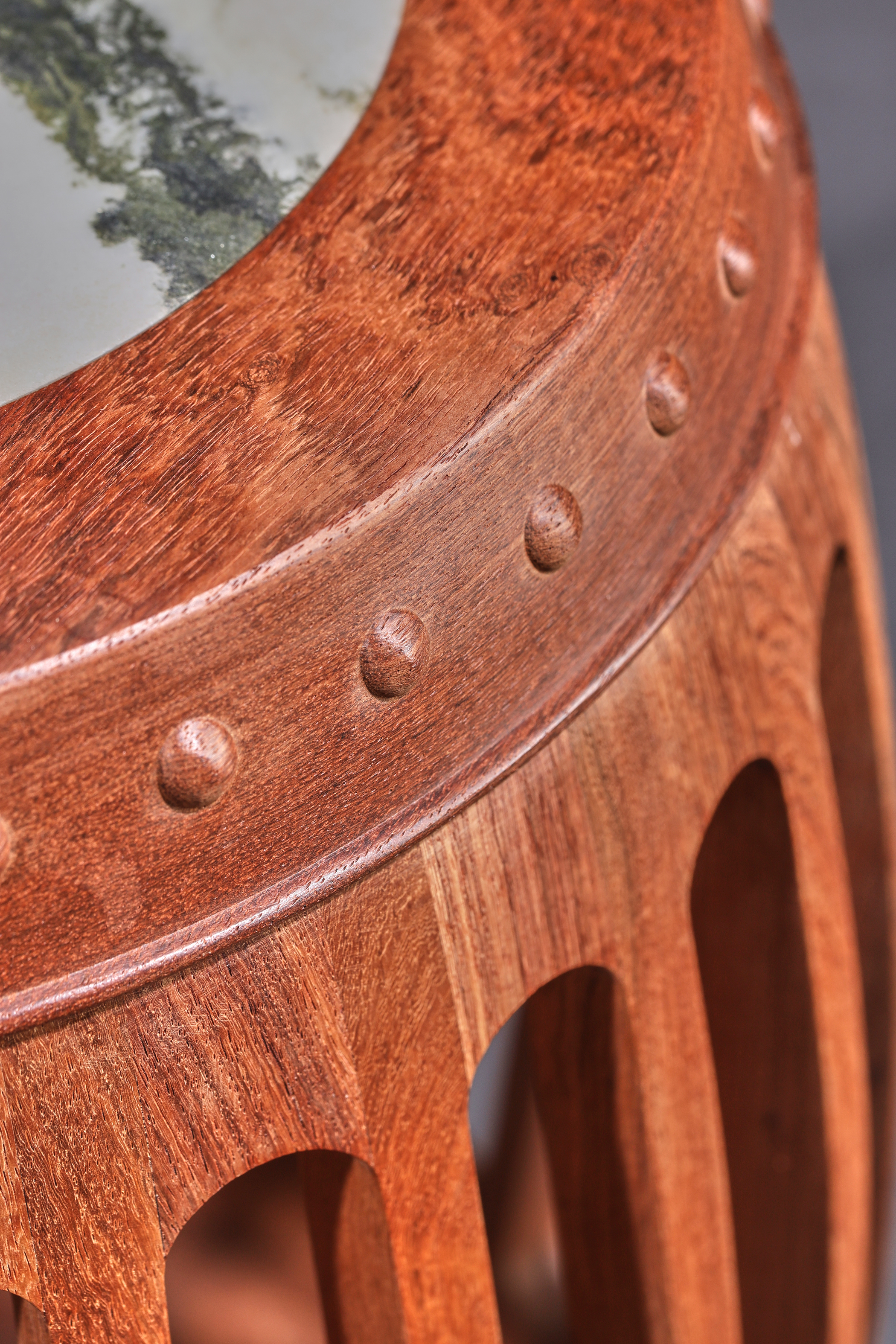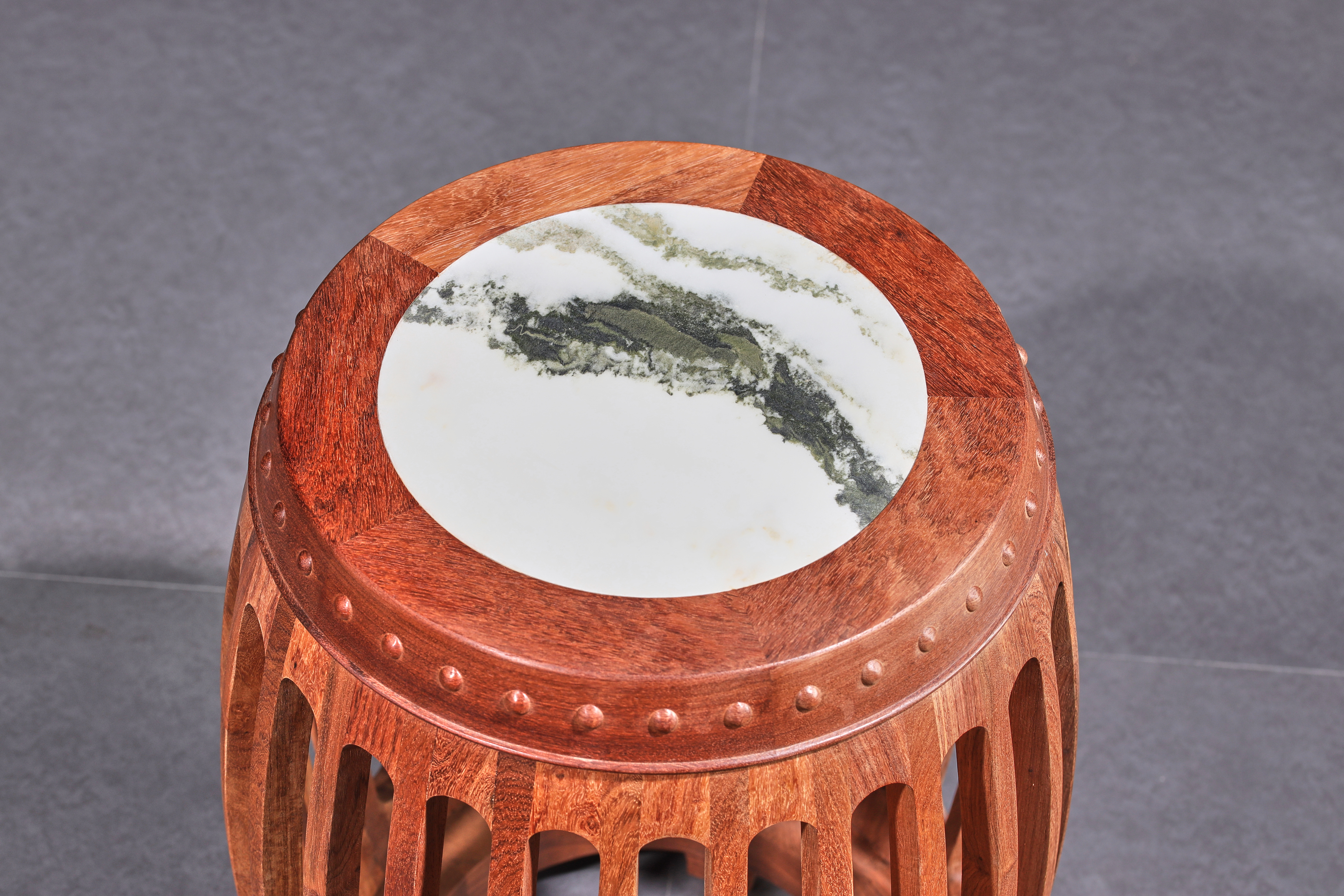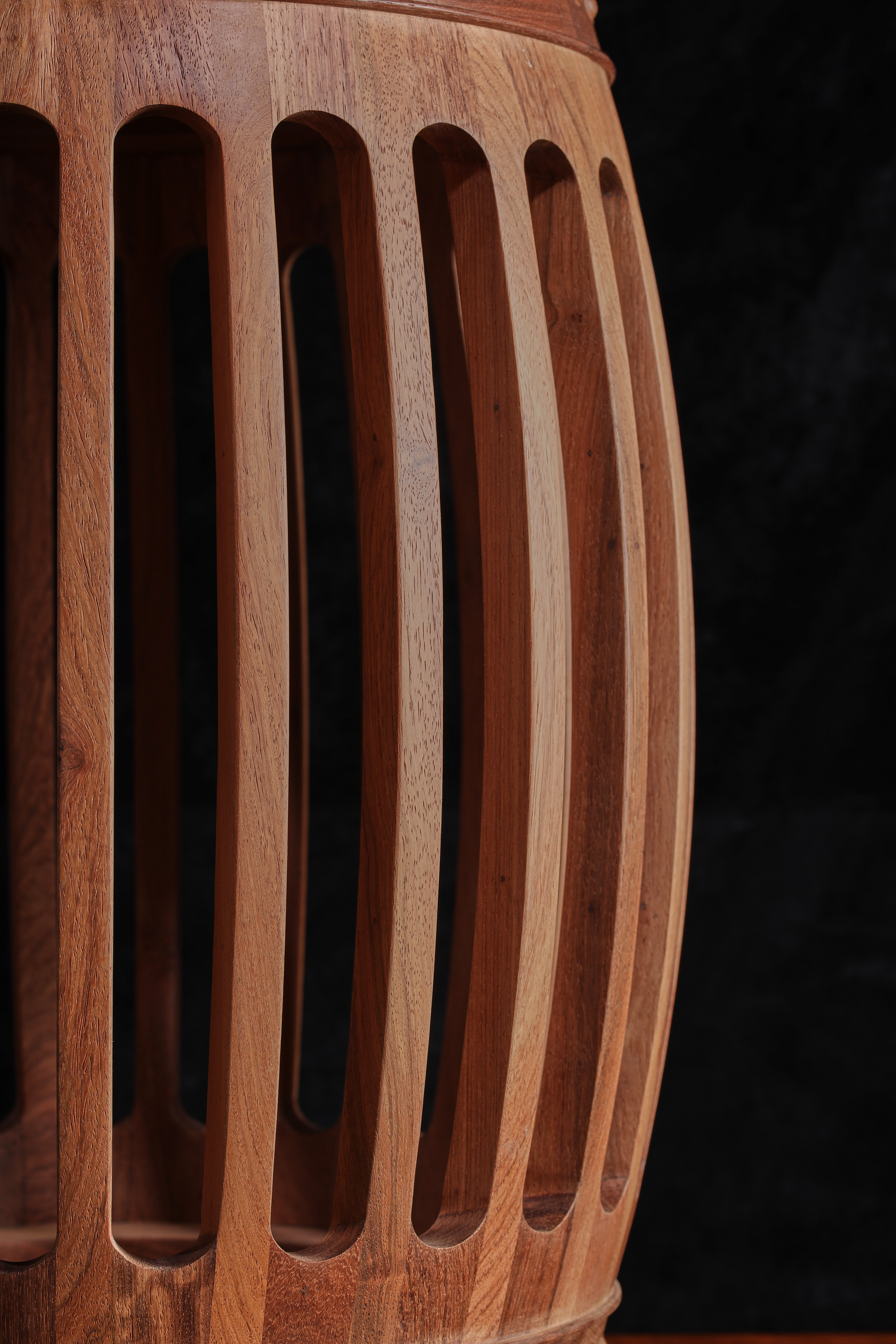 此墩原型为清·紫檀直棂式坐墩,外形仿鼓造型,坐面攒框镶云石面,上下两排鼓钉整齐规矩,腔体膨出,以二十四根弧形直棂攒成,造法上吸取了直棂窗及鸟笼的设计,整体空灵有致,底部装六足,平稳而美观,造型别致,十分少见。