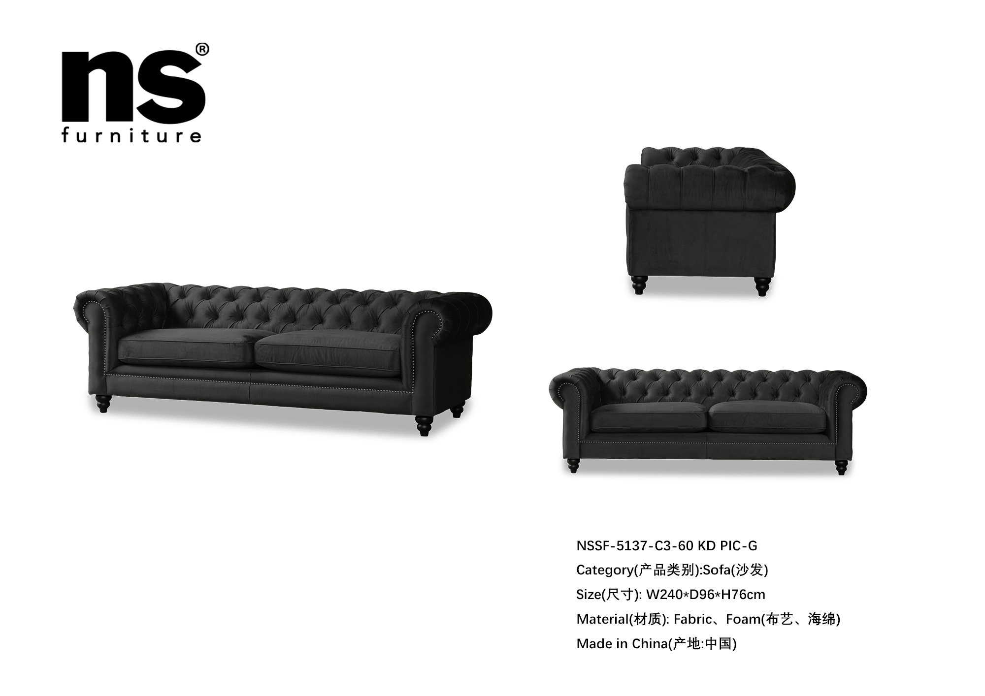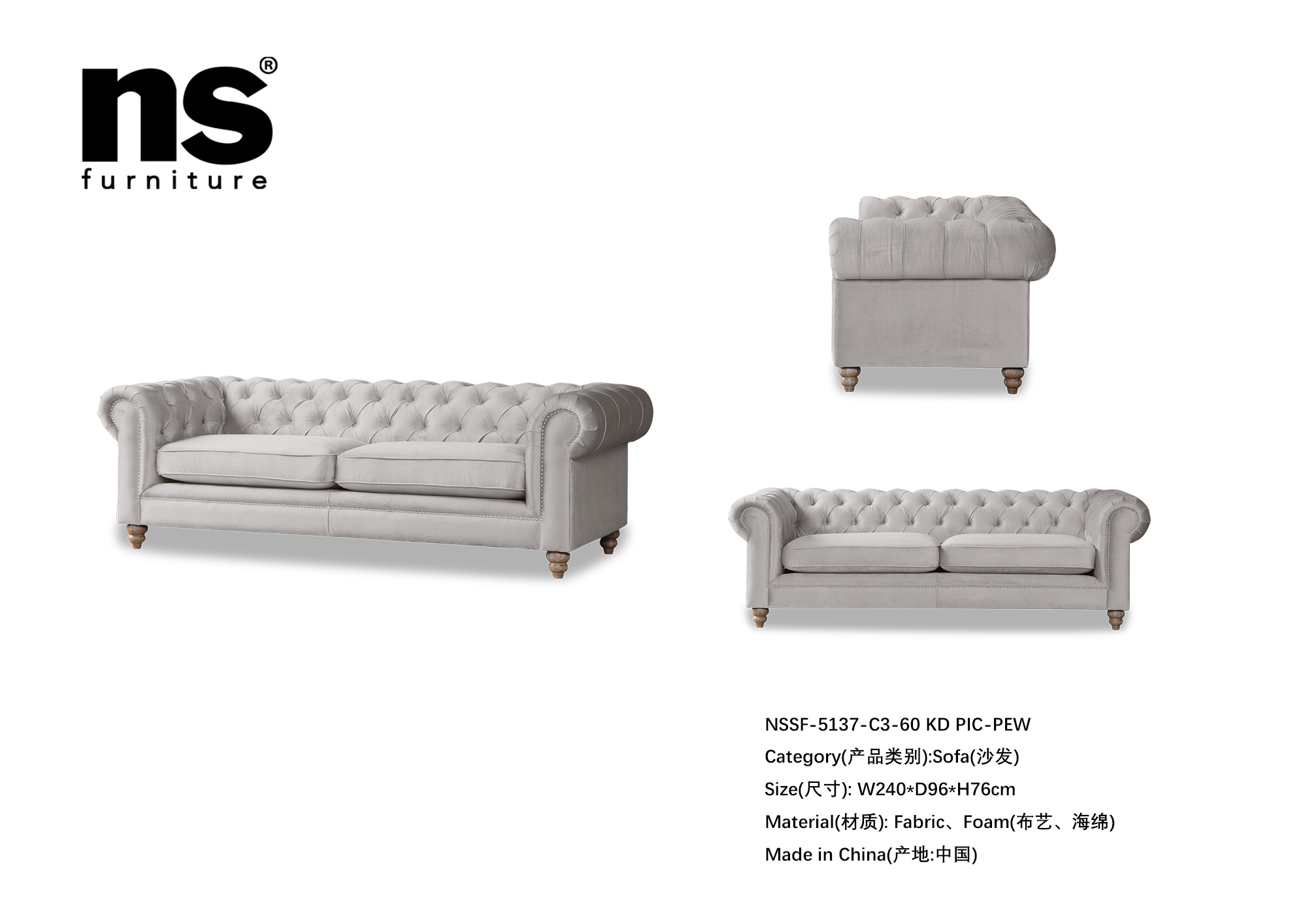 NS家居ns furniture软包活套布艺三人位沙发NSSF-5137-C3-60 KD