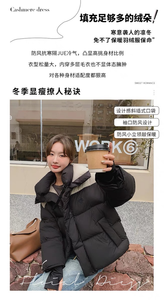 本次我们推荐的面包服保暖性好,穿着过冬很舒服,软糯又舒适~版型十分干脆利落,还最大程度遮掉了身上的肉肉!