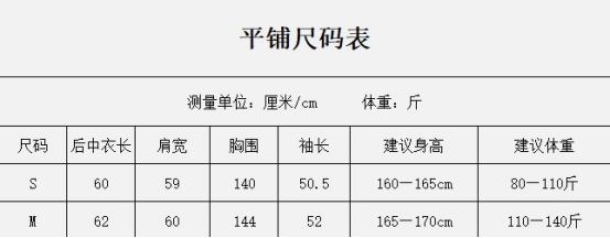 尺码: S码80~110斤 M码110~140斤 尺码表