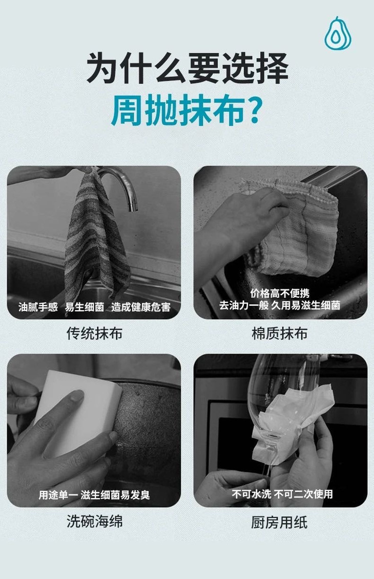 可水洗重复利用,天竹纤维也不易藏污纳垢不发臭,一周一换不心疼抹布非常厚实吸水吸油效果都超好用来擦拭灶具,桌面,地面,洗碗都很干净~ 反复使用,每周更换,健康卫生,这不得先整几袋回家!