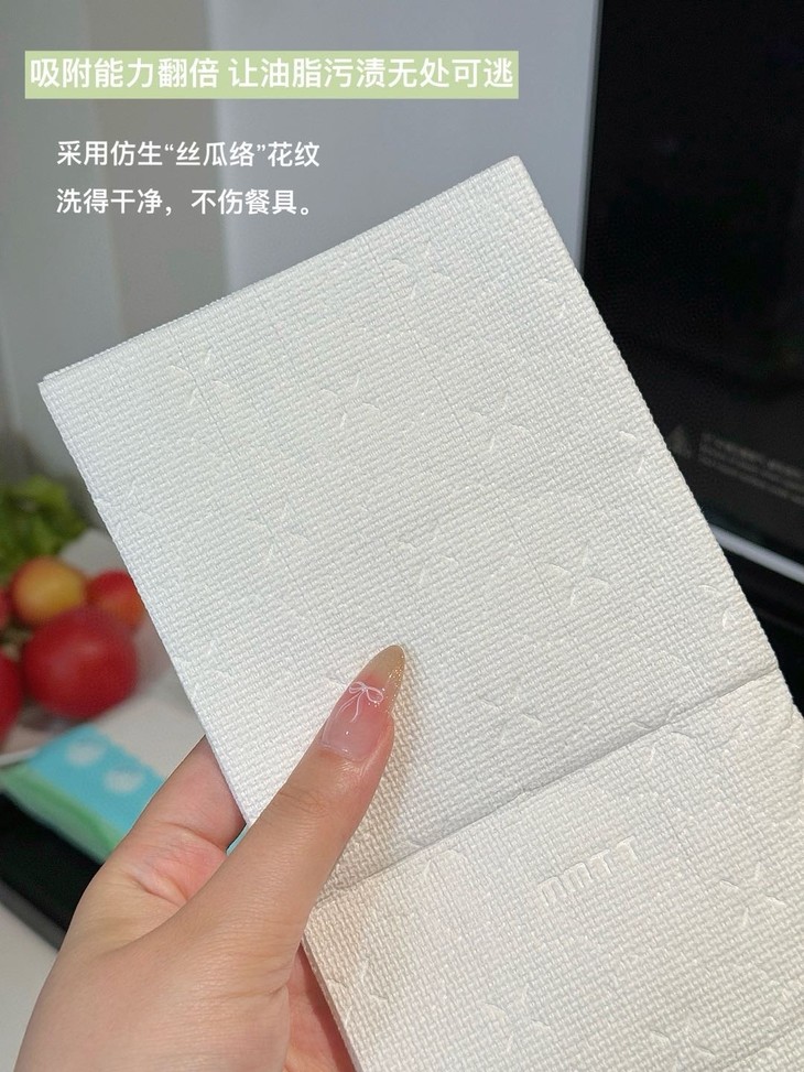 主打一个吸油不锁油,用它擦过的碗洁净不油腻,使用下来感觉真的很不错 而且它只是一块小小的一次性抹布,但是工艺也是实打实的。 无纺布材质加大加厚,手感柔软还不掉絮,用起来可得劲了