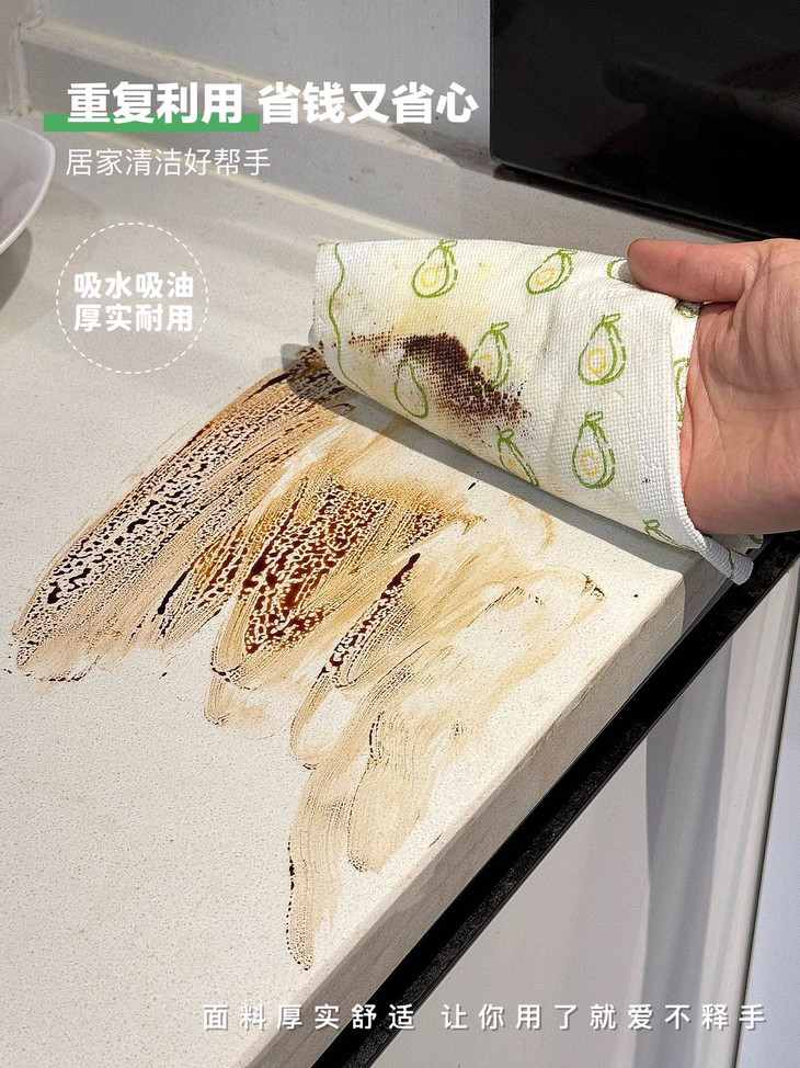 妈妈都夸我很会买! 厨房有这个抹布就够啦!! 哇塞!完全看不到污渍的痕迹,简直绝了👍 这块超大抹布吸附力超强,一大片污渍轻松搞定。 只需用水一冲,污渍瞬间消失,连搓洗的步骤都省了,干净又卫生,太实用啦