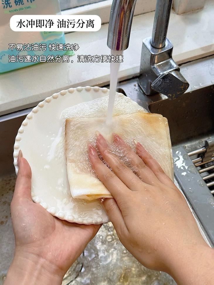 抹布是木质纤维的,这个材质很神奇祛油但不沾油! 我洗不太油的餐具,现在都不用洗洁精 毕竟洗洁精残留也不太安全。 直接清水用抹布擦洗就能把油污去除,抹布上的脏污用清水也能冲洗干净。