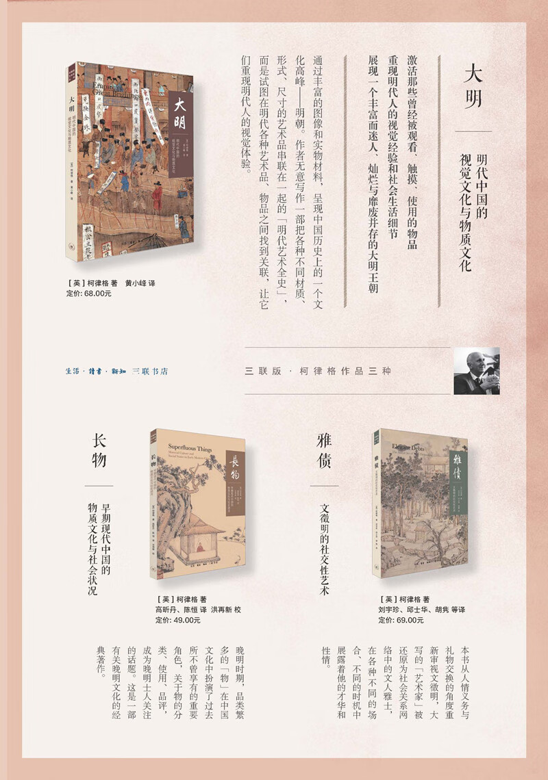 柯律格(Craig Clunas)1954年出生于英国苏格兰阿伯丁,现任英国牛津大学艺术史系讲座教授,曾任伦敦维多利亚与艾伯特博物馆(Victoria & Albert Museum)中国部资深研究员兼策展人15年,并自1994年起先后执教于萨塞克斯大学(University of Sussex)艺术史系及伦敦大学亚非学院(SOAS)。自1991年起陆续出版《长物:早期现代中国的物质文化与社会状况》(Superfluous Things: Material Culture and Social Status in Early Modern China, 1991)、《丰饶之地:明代中国的园林文化》(Fruitful Sites: Garden Culture in Ming Dynasty China, 1996)、《早期现代中国的图画与视觉性》(Pictures and Visuality in Early Modern China, 1997)、《中国艺术》(Art in China, 1997)及《雅债:文征明的社交性艺术》(Elegant Debts: the Social Art of Wen Zhengming, 1470-1559 ,2004)、《大明之国:明代中国的视觉文化与物质文化》(Empire of Great Brightness: Visual and Material Cultures of Ming China, 1368-1644, 2007)等著作。2014年,大英博物馆举办他与霍吉淑合作策划的大型展览“明朝盛世五十年”(Ming: 50 Years that Changed China, 1400-1450)。