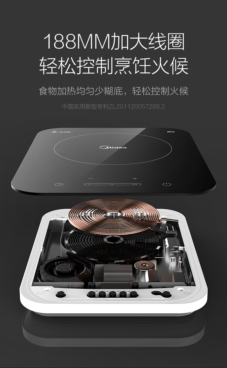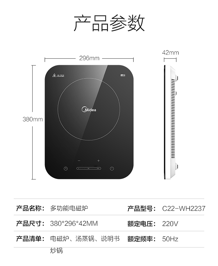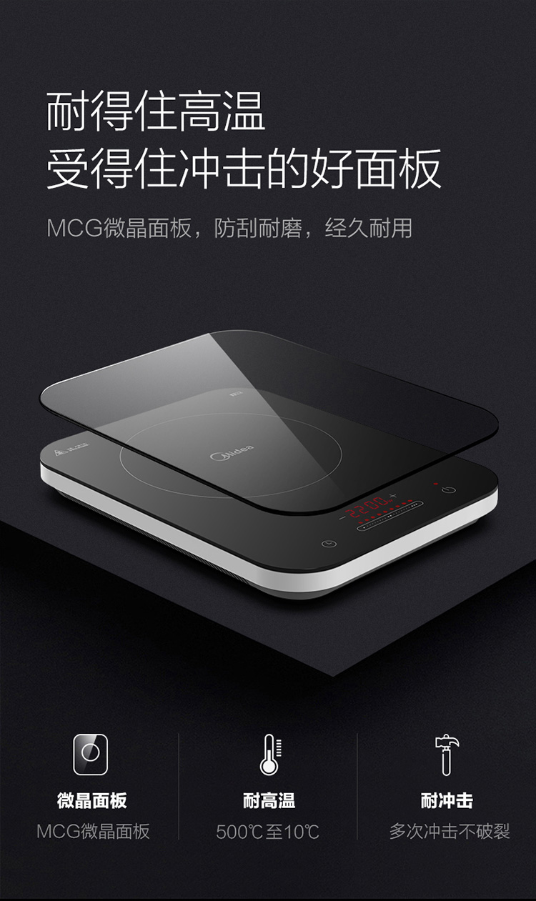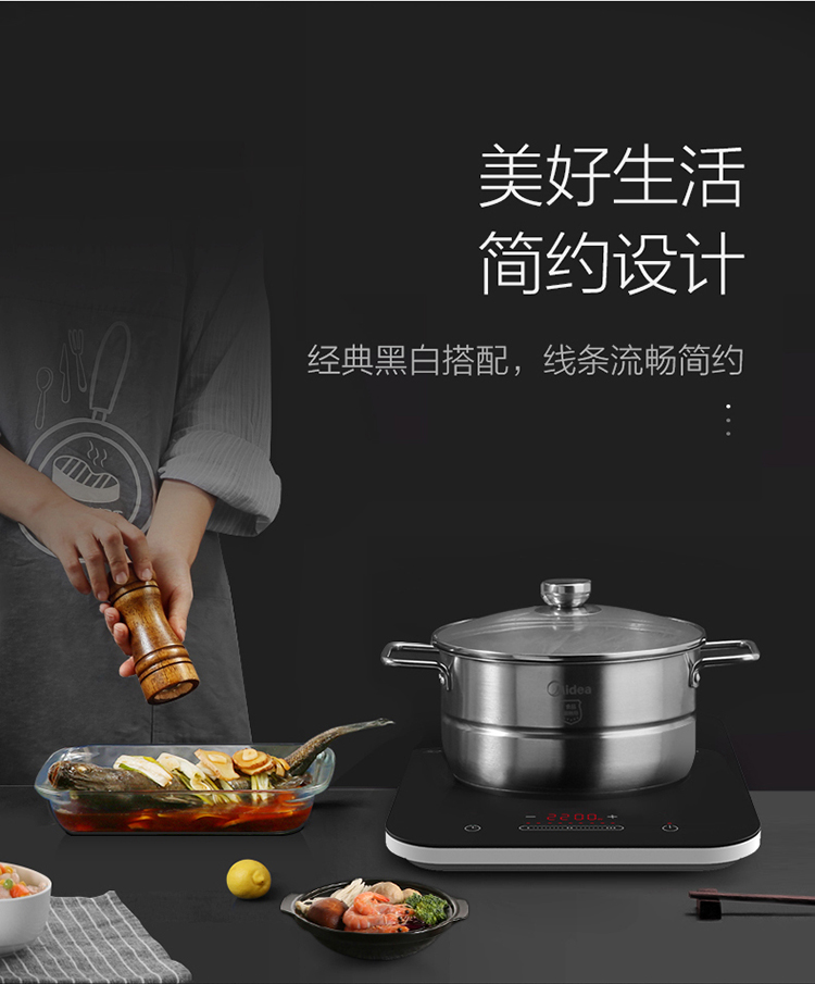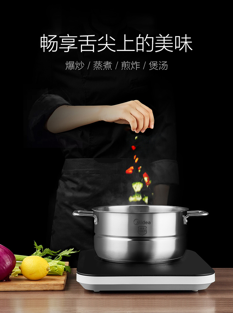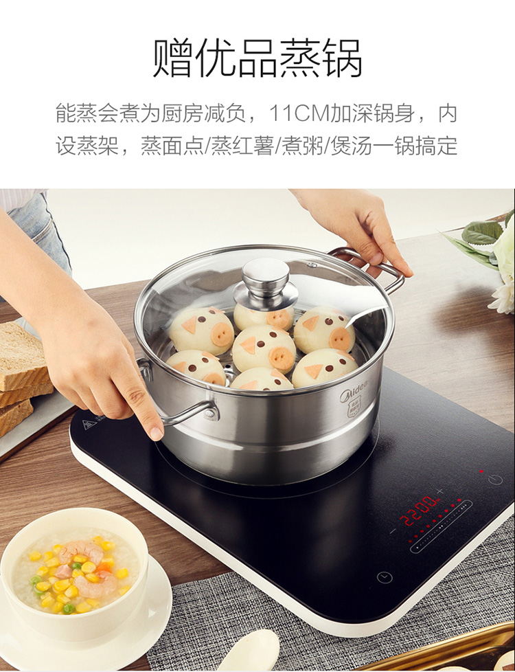 美的(Midea)电磁炉 恒匀火不间断加热 匀火188mm大线圈盘 滑控 微晶面板 C22-WH2237(赠汤蒸锅+渗氮炒锅)