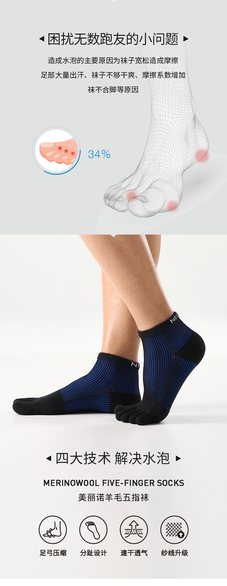 26新品内道美利奴羊毛五指袜局部压缩透气跑步马拉松越野跑五指袜