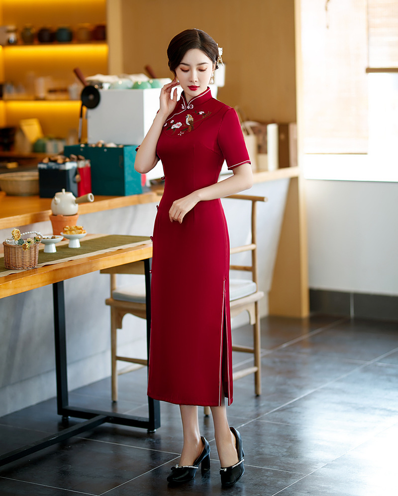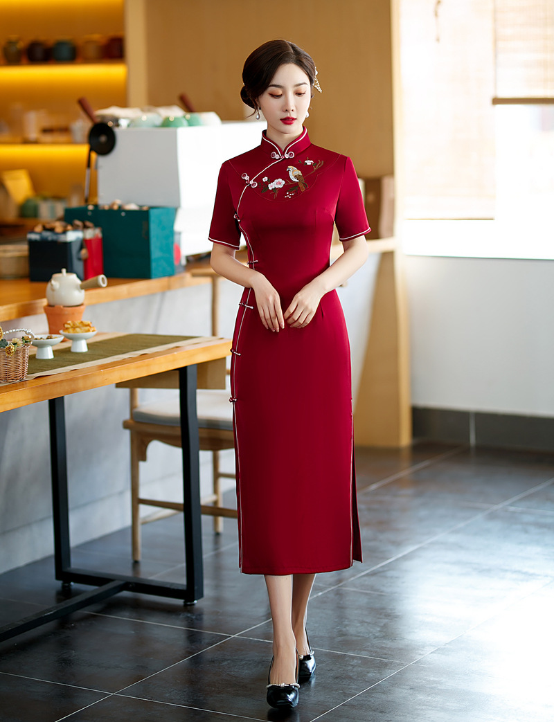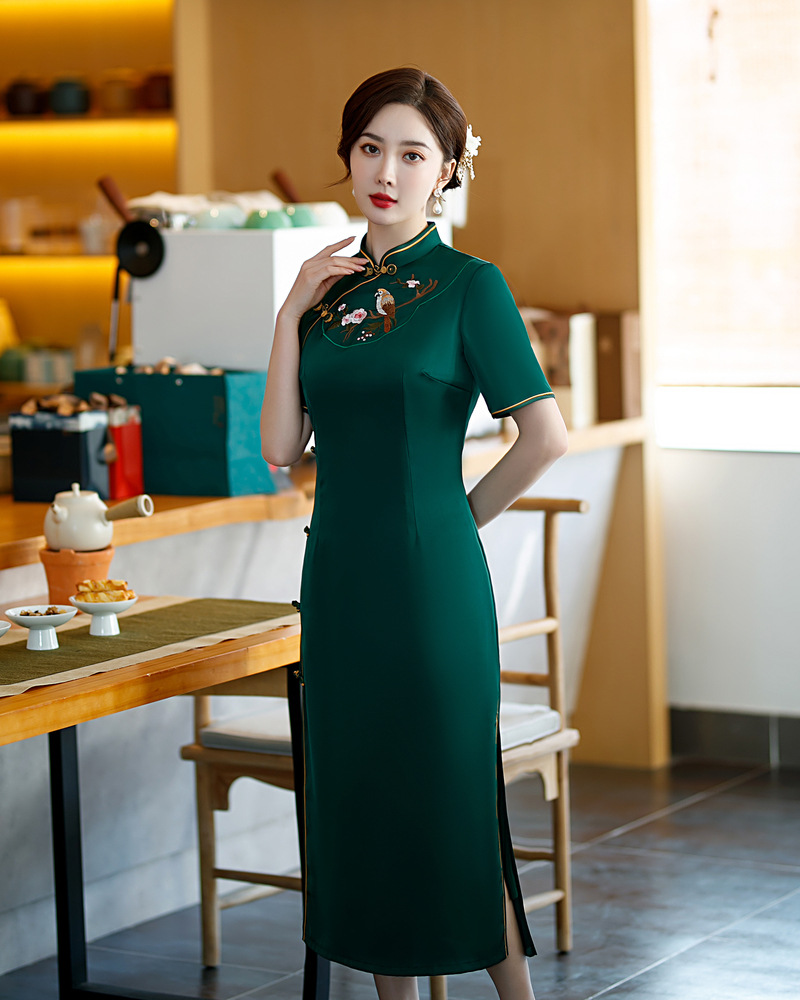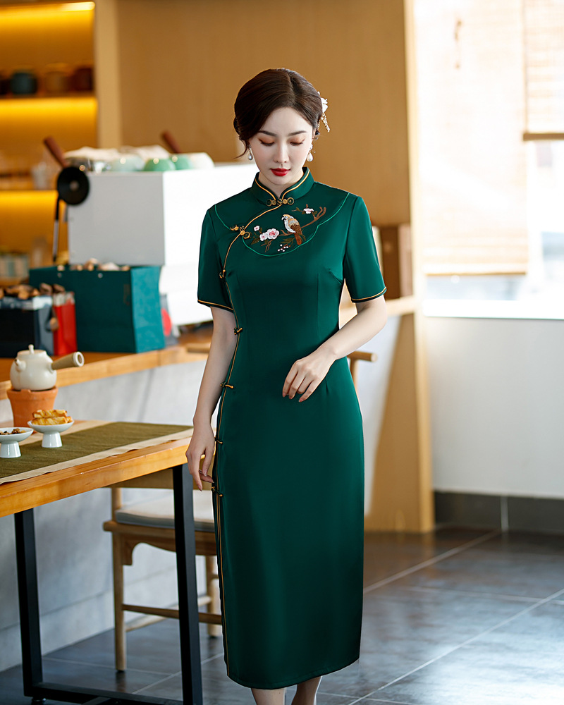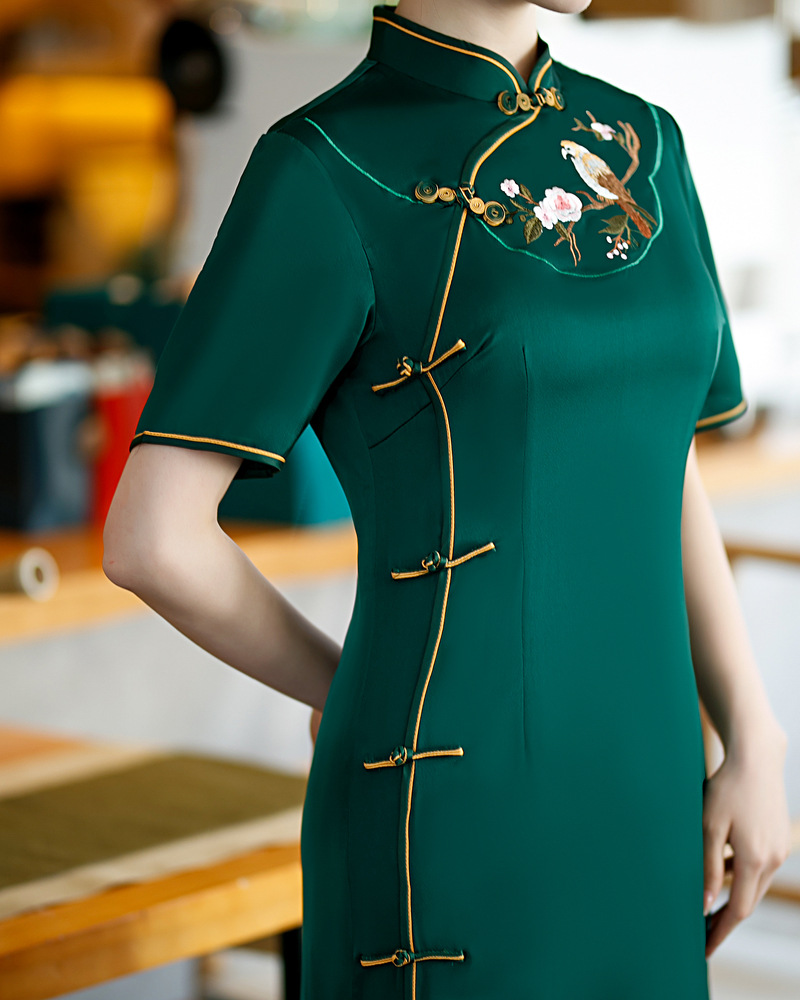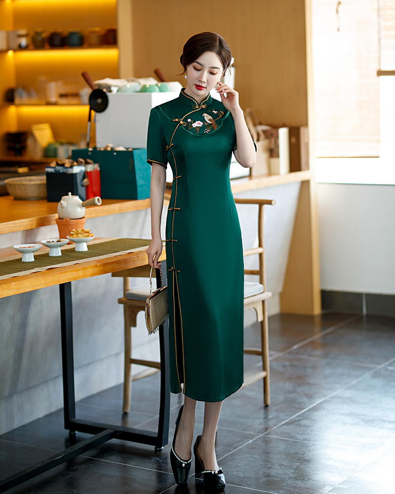 高端气质,仿醋酸长款八扣走秀绣花立领旗袍YMT-602
