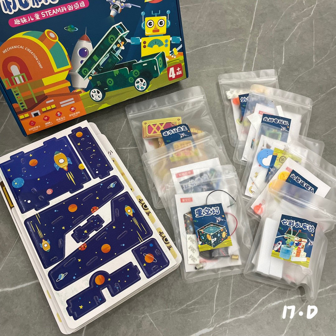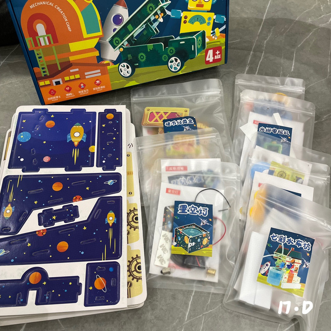【规格】一盒包含:八款材料包:招财猫,星空灯,硬币分类盒,火箭运输队,光栅电视机,双轨怪坡,七彩水车坊,外面小哥