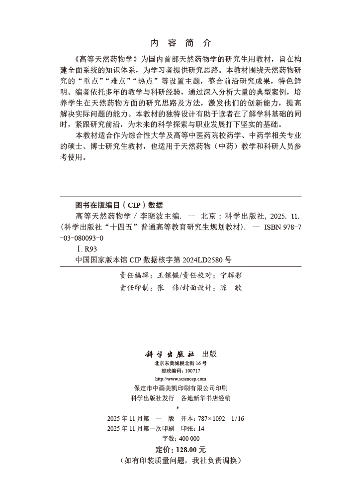 高等天然药物学 十四五普通高等教育研究生规划教材 李晓波 主编 研究生教材 医学 药学 药物化学 9787030800930 科学出版社