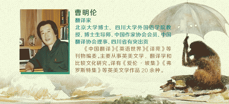 曹明伦,翻译家,北京大学博士,四川大学外国语学院教授、博士生导师;中国作家协会会员,中国翻译协会理事,四川省有突出贡献的优秀专家、guo wu yuan*特殊津贴专家;《中国翻译》《英语世界》《译苑》等刊物编委。主要从事英美文学、翻译学和比较文化研究。译有《爱伦·坡集》《弗罗斯特集》等英美文学作品20余种。