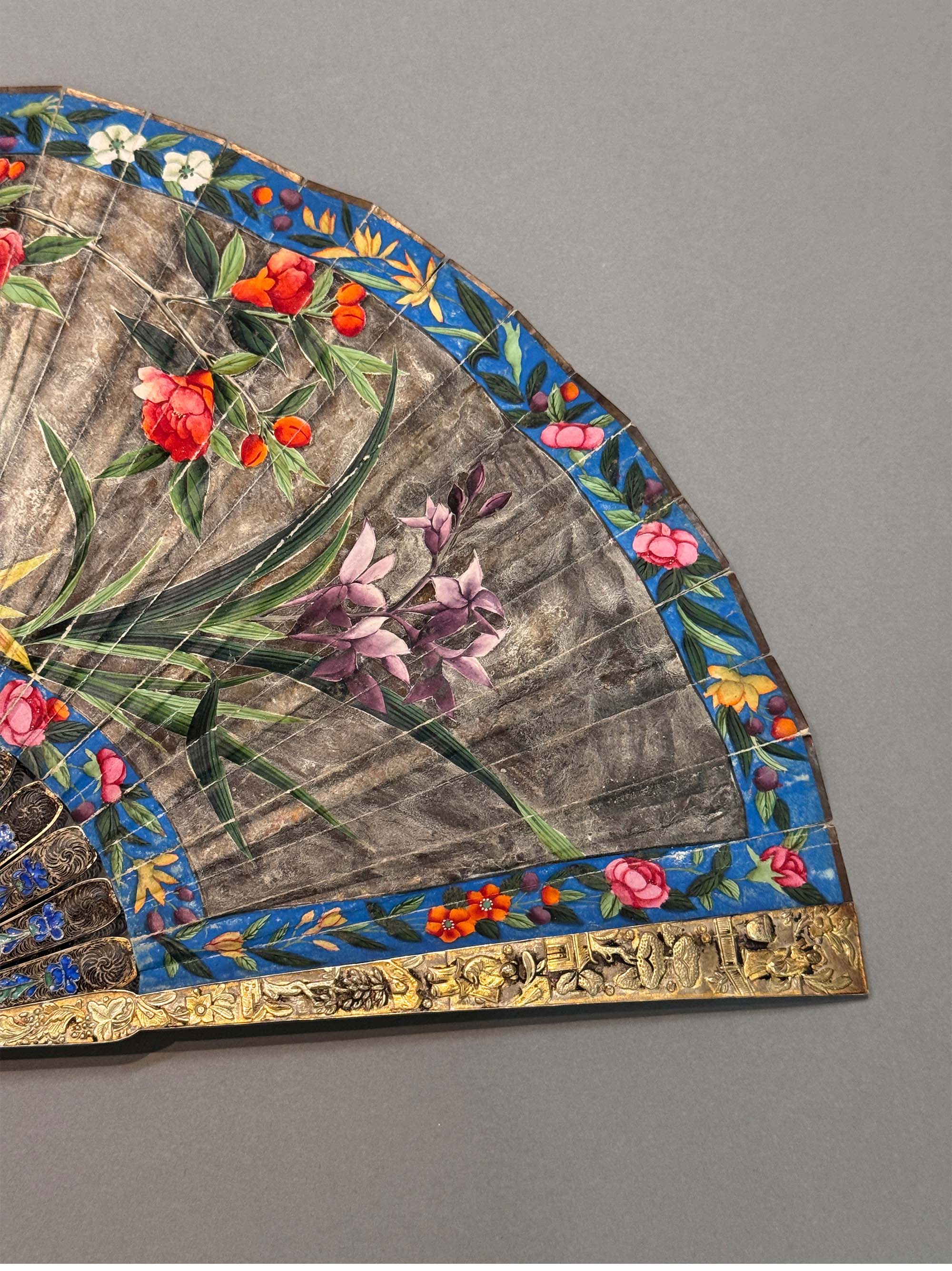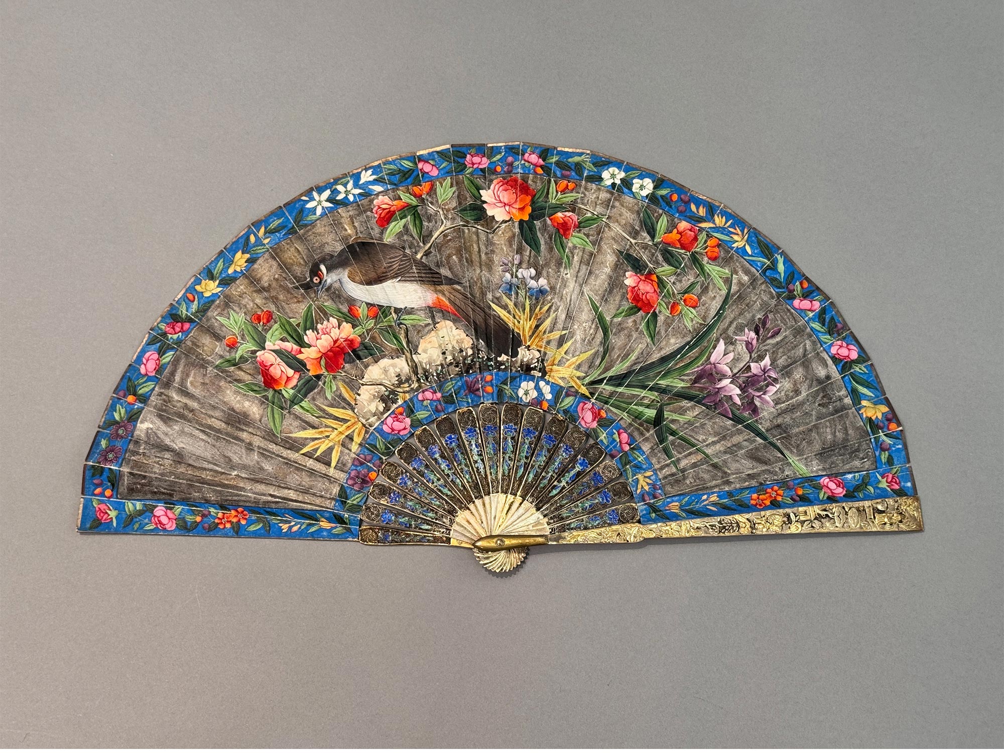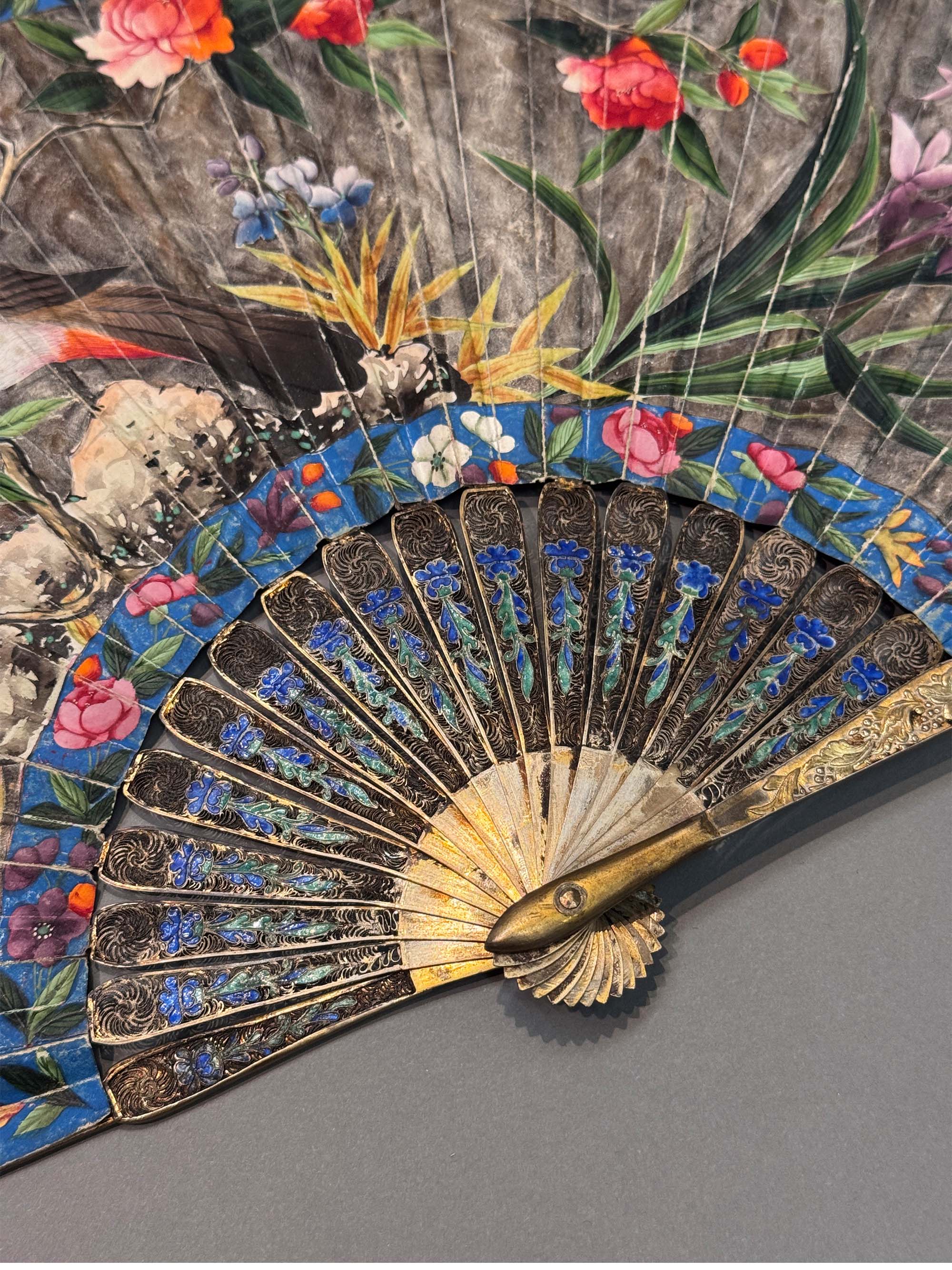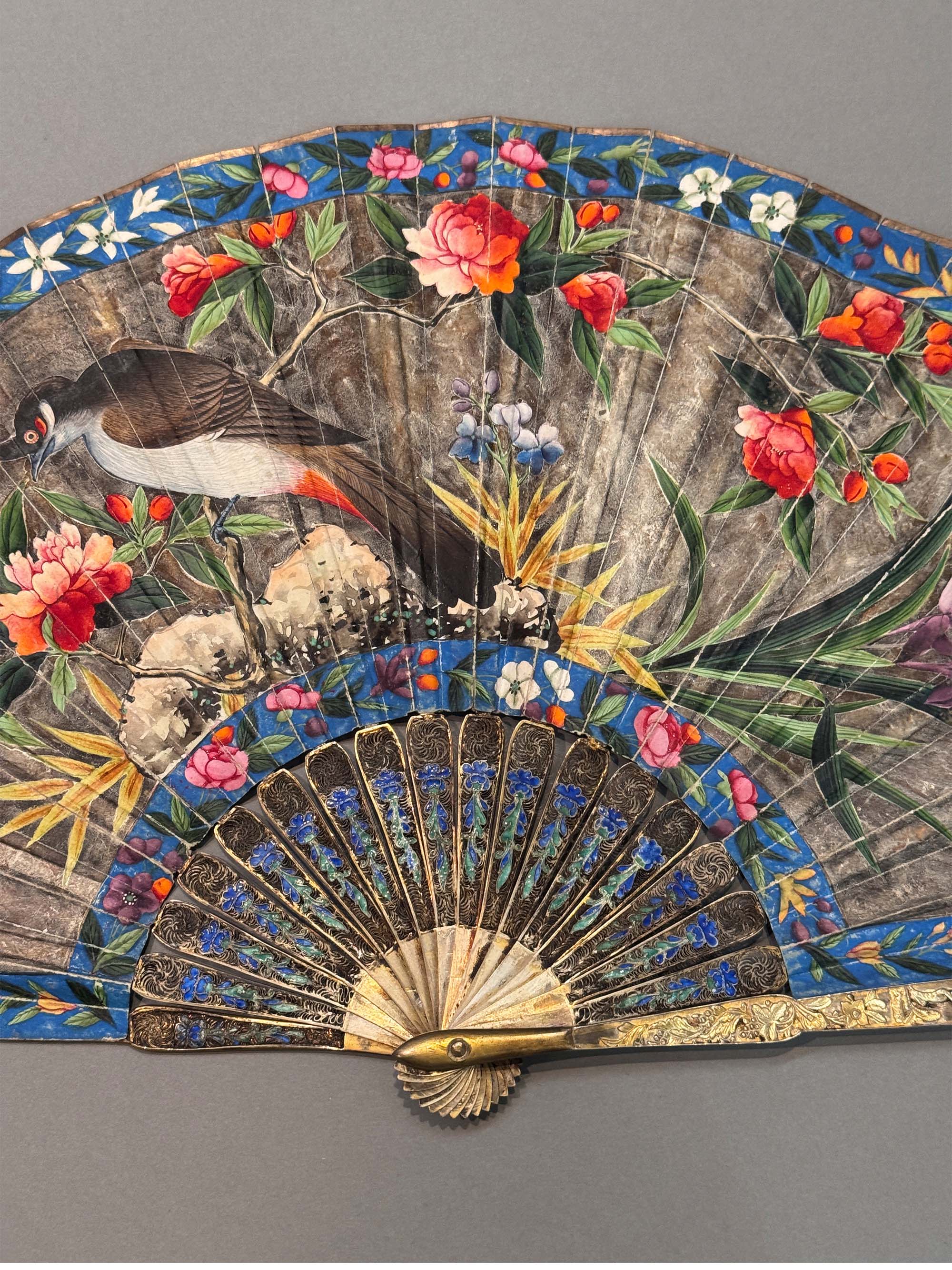 19世纪中国广东十三行出品银鎏金累丝烧蓝扇骨装饰花鸟庭园主题纸本彩绘双扇面折扇