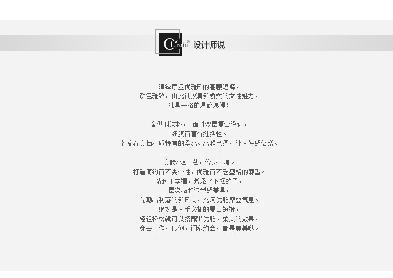 “精致”是欧芮儿olrain品牌文化的核心,欧芮儿认为,精致的女人,不但要外在动人,更要内在迷人,内外兼修,有魅力、有气质、有内涵,自信而不自傲,优雅而不矫揉,自有万种风情而不轻浮,更不故作矜持。