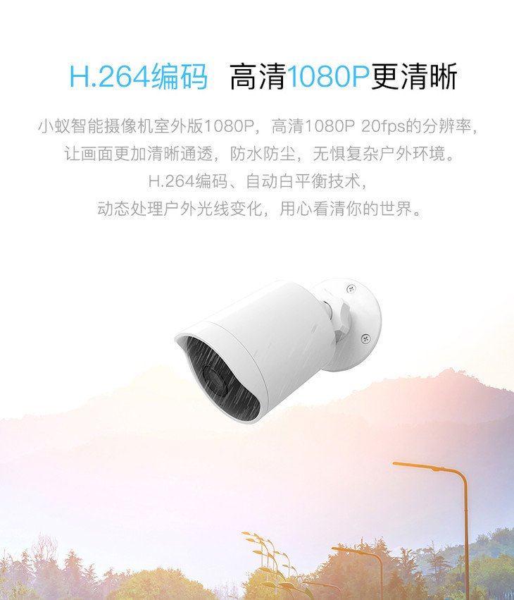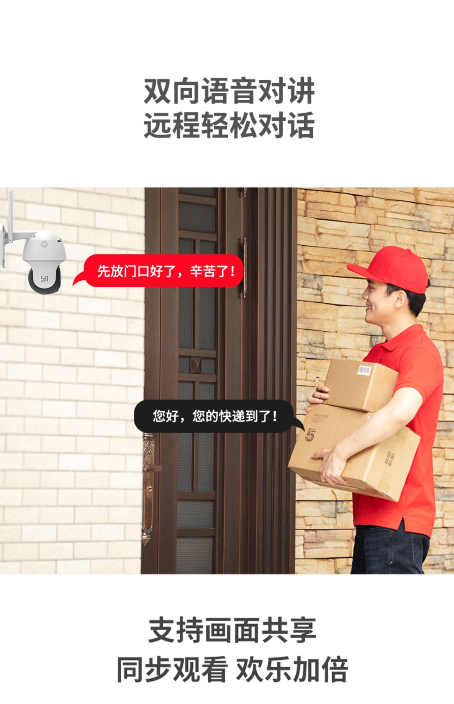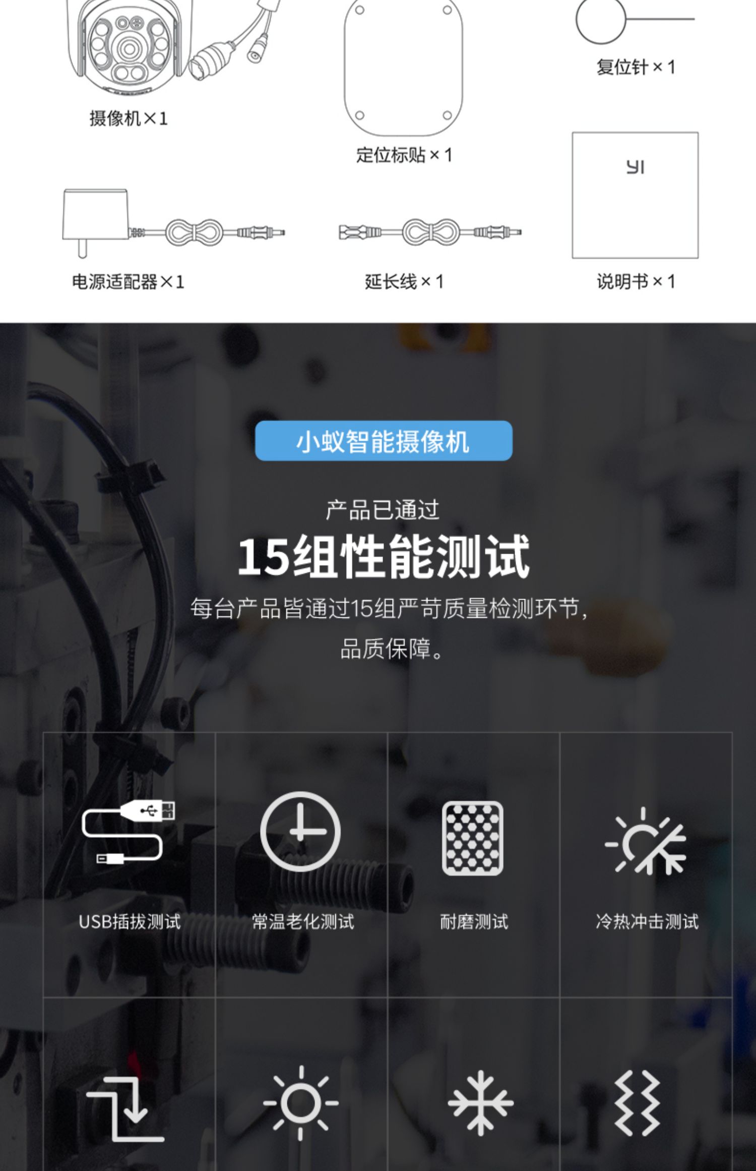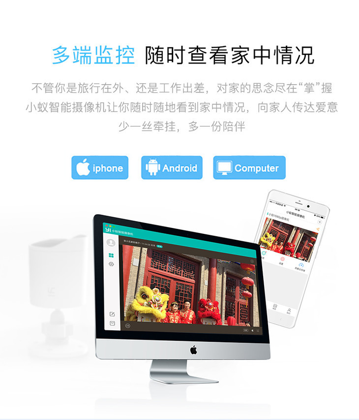 - 小蚁智能摄像机——随意放置任意角落,通过手机或平板,随时随地视频观察家中情况。即使不在家,也可随时进行双向语音通话,远程与家人互动,抓拍欢乐瞬间,不错过任何精彩时刻。