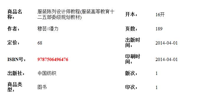由穆芸、潘力编著的《服装陈列设计师教程(服装高等教育十二五部委级规划教材)》是服装高等教育“十二五”部委级规划教材,也是《视觉·服装——终端卖场陈列规划》一书的姐妹篇、提升篇。本书围绕着零售业服装服饰店铺、卖场,由浅至深地介绍了视觉营销陈列设计工作所要进行的项目和流程。书中各章皆采用大量图片和表格,以帮助学习者理解,并以作者自身参与的案例进行解读,并附有问题思考、调研作业。书中提供了大量具有时效性的欧洲、日本、韩国的最新陈列资料和图片,为陈列设计人员提供参考和学习。