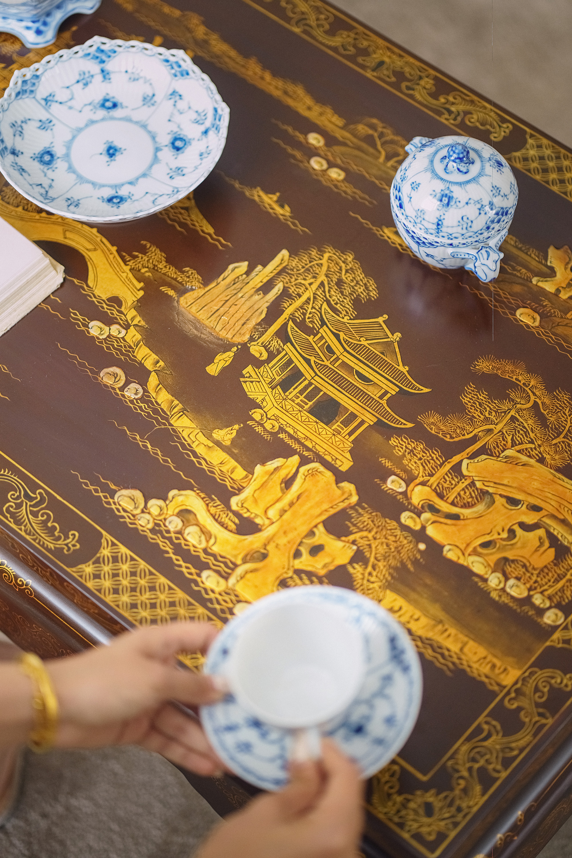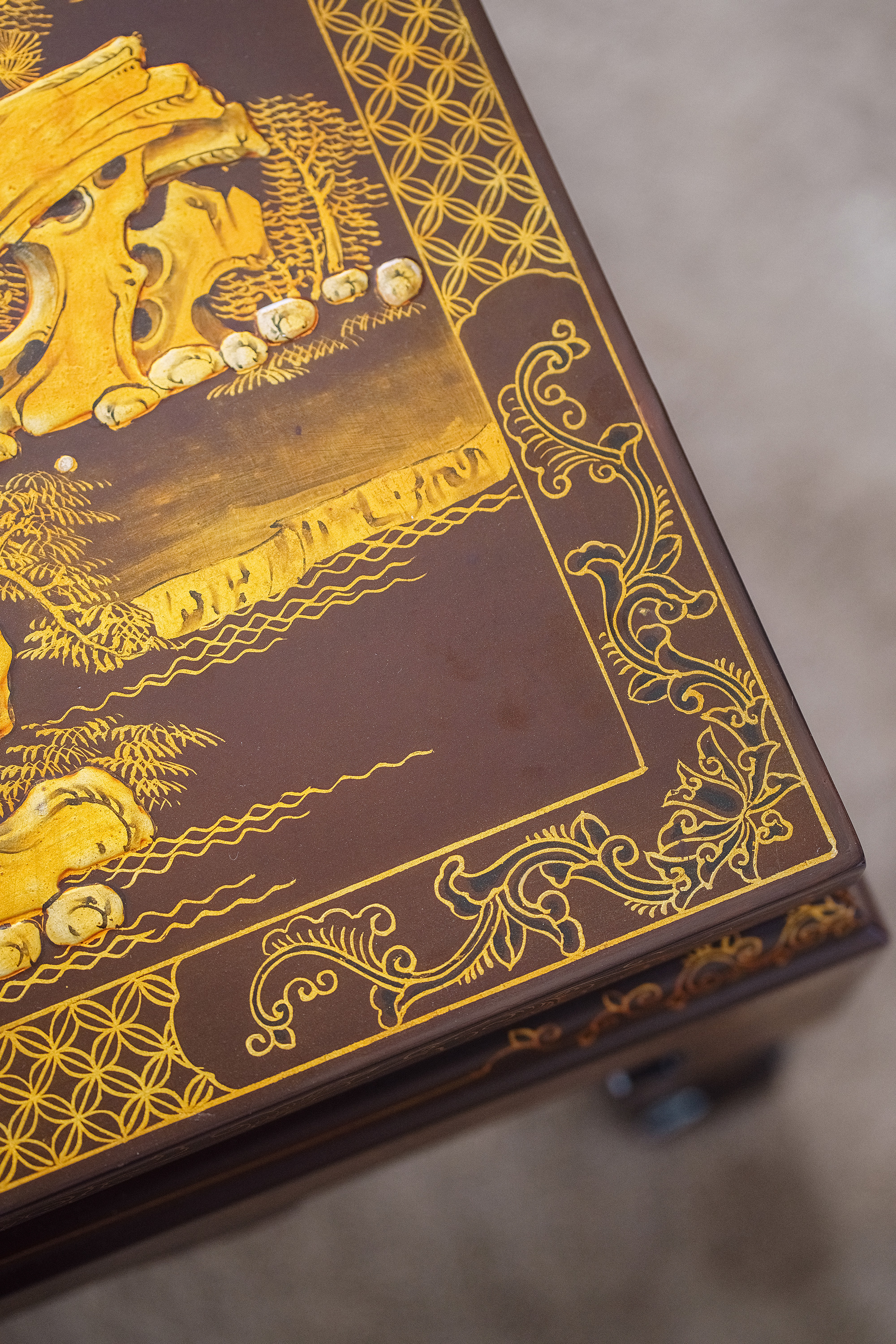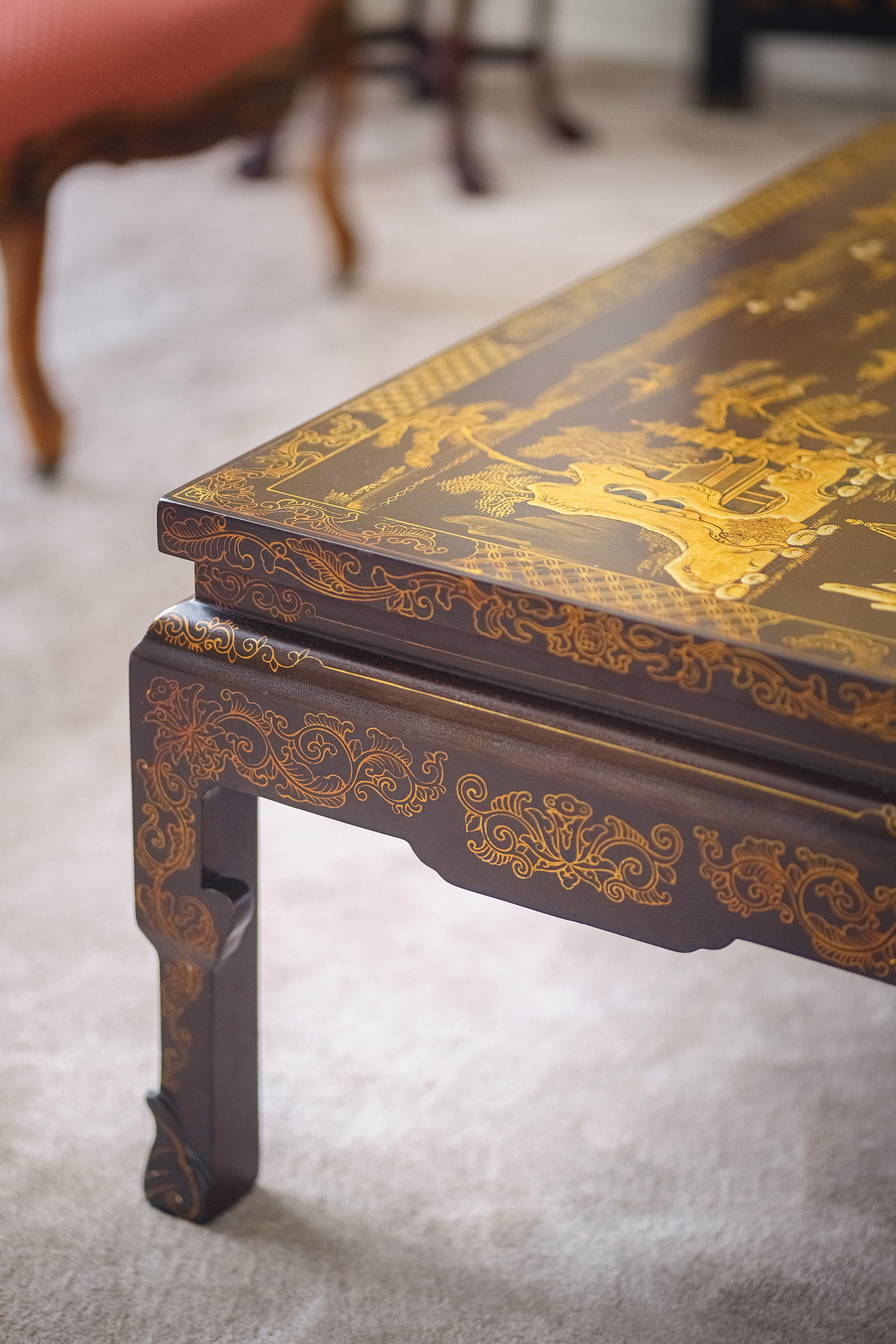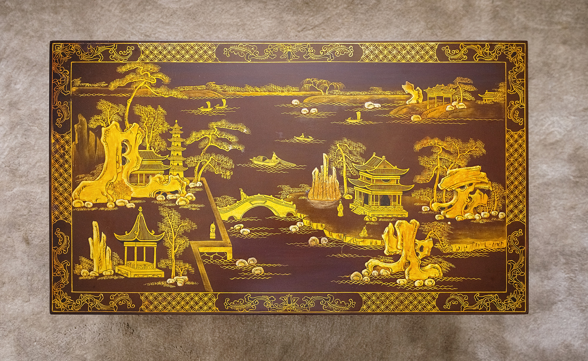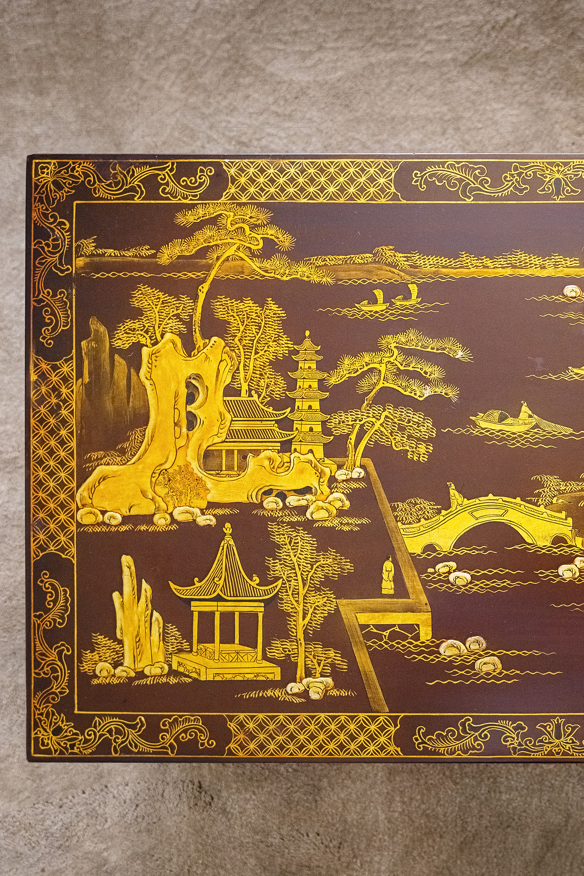 19世纪中国清代出品东方山水楼阁主题螺钿镶嵌木胎黑漆描金矮桌几