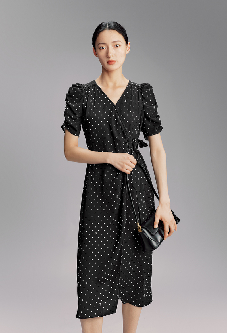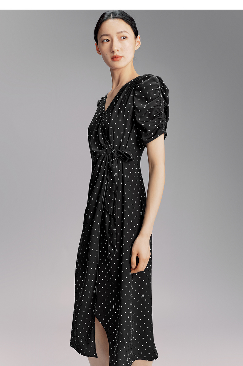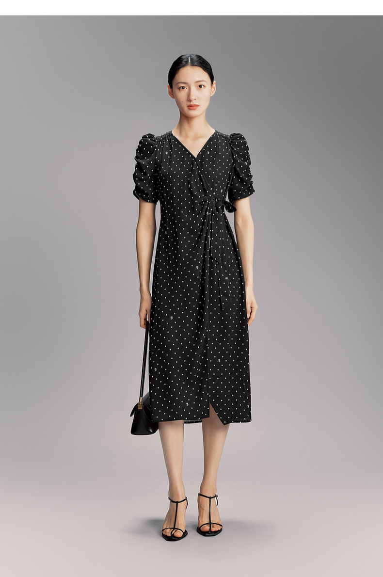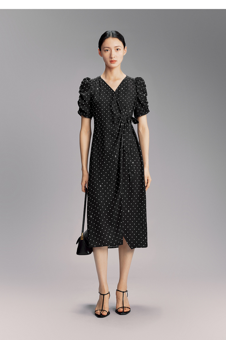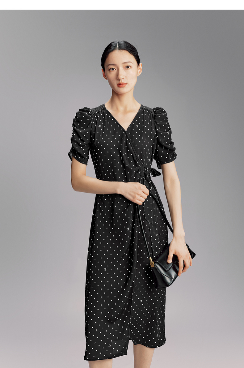 【商场同款】伊芙丽春秋法式波点泡泡袖显瘦围裹式连衣裙1F7291004