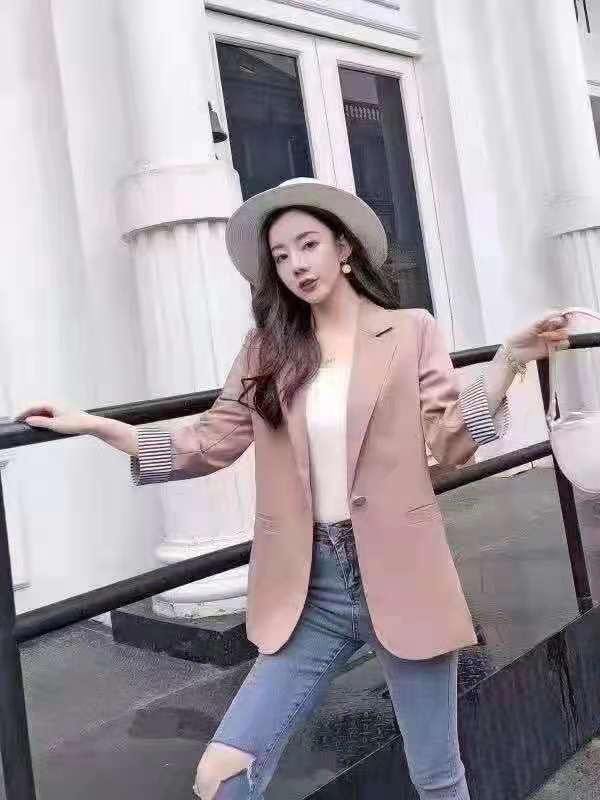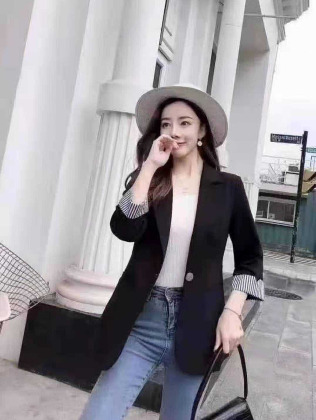 商品介绍:休闲西服外套,面料微弹,穿着舒适,挑肩设计,穿着有型显瘦,七分袖简单干练,条纹挽边袖口,画龙点睛,时尚俏皮,可以搭配牛仔裤,裙子,适合20-45岁穿着