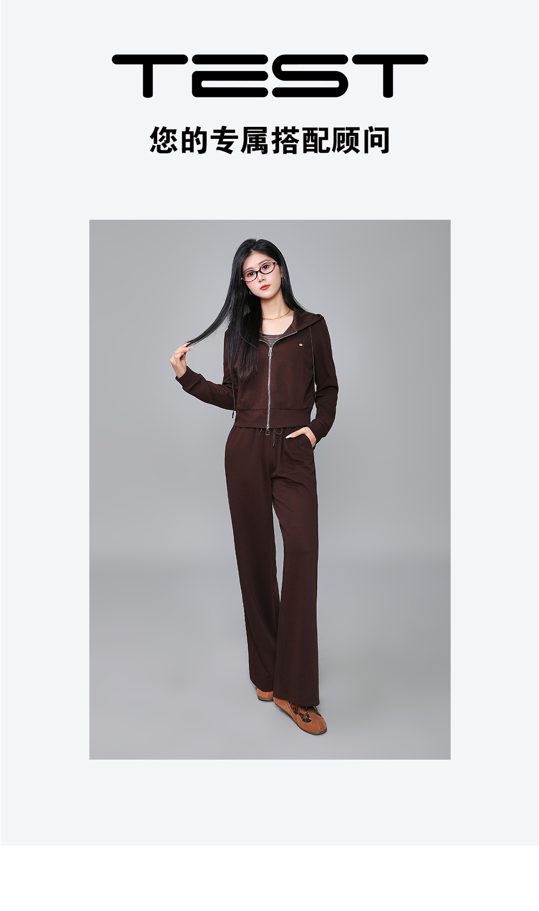 秋上新休闲风棕色拉链连帽上衣配条纹背心与阔腿裤套装裤4253044