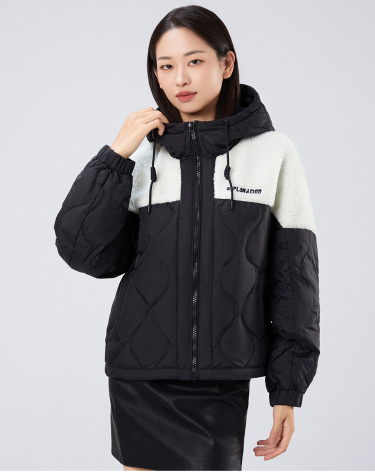 采用了羽绒和羊羔毛的拼接设计。羽绒的轻盈保暖与羊羔毛的柔软厚实相结合,简直是天作之合。羽绒负责在寒冷的空气中锁住温暖,羊羔毛则像亲密的伙伴,进一步加强保暖效果,让你感受到加倍的温暖。而且这种拼接设计非常巧妙穿上后完全不会显臃肿,反而营造出一种时尚又随性的感觉,就像被温暖的时尚氛围所包围,让人一看就觉得温暖又舒适。